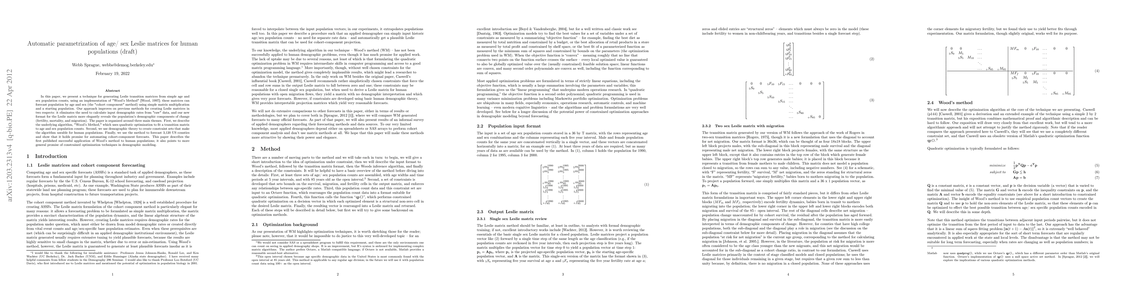 This paper introduces an automated method for generating Leslie transition matrices from age and sex population counts using "Wood's Method," which optimizes demographic forecasts without requiring raw demographic rate calculations. The new matrix format enhances clarity of fertility, mortality, and migration components.