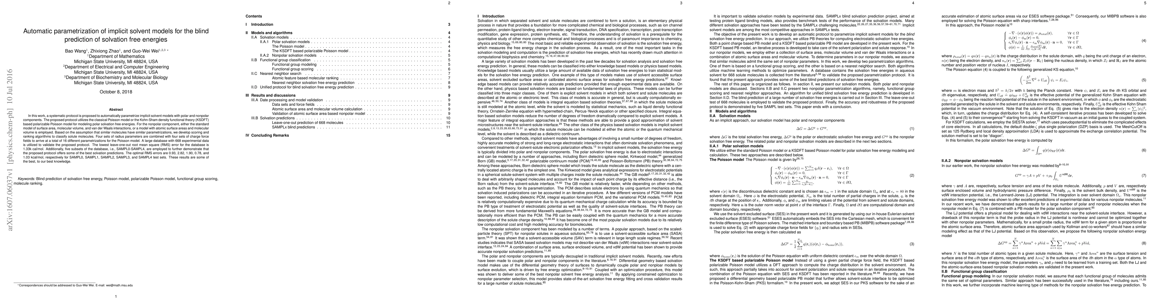 This paper proposes an automatic protocol for parametrizing implicit solvent models to predict solvation free energies, achieving optimal RMS errors of 1.33 kcal/mol on a large database and 0.93 to 2.82 kcal/mol on five subsets, demonstrating high accuracy in solvation predictions.