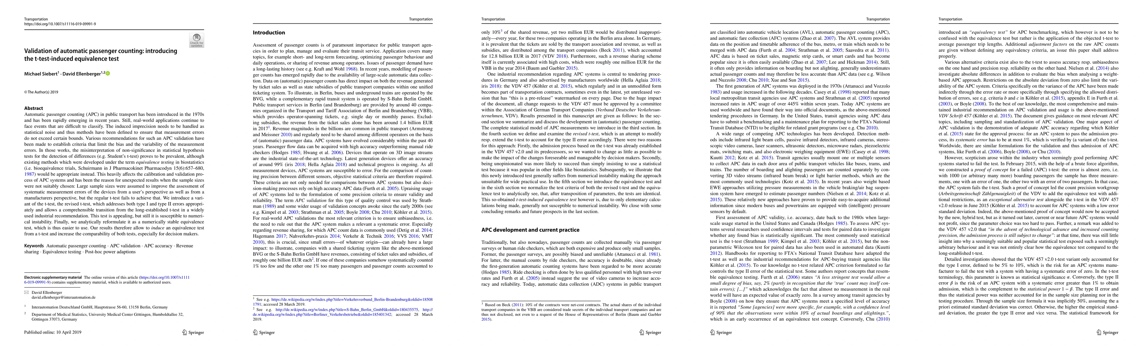 Automatic passenger counting (APC) in public transport has been introduced in the 1970s and has been rapidly emerging in recent years. Still, real-world applications continue to face events that are difficult to classify. The induced imprecision needs to be handled as statistical noise and thus methods have been defined to ensure that measurement errors do not exceed certain bounds. Various recommendations for such an APC validation have been made to establish criteria that limit the bias and the variability of the measurement errors. In those works, the misinterpretation of non-significance in statistical hypothesis tests for the detection of differences (e.g. Student's t-test) proves to be prevalent, although existing methods which were developed under the term equivalence testing in biostatistics (i.e. bioequivalence trials, Schuirmann in J Pharmacokinet Pharmacodyn 15(6):657-680, 1987) would be appropriate instead. This heavily affects the calibration and validation process of APC systems and has been the reason for unexpected results when the sample sizes were not suitably chosen: Large sample sizes were assumed to improve the assessment of systematic measurement errors of the devices from a user's perspective as well as from a manufacturer's perspective, but the regular t-test fails to achieve that. We introduce a variant of the t-test, the revised t-test, which addresses both type I and type II errors appropriately and allows a comprehensible transition from the long-established t-test in a widely used industrial recommendation. This test is appealing, but still it is susceptible to numerical instability. Finally, we analytically reformulate it as a numerically stable equivalence test, which is thus easier to use. Our results therefore allow to induce an equivalence test from a t-test and increase the comparability of both tests, especially for decision makers.