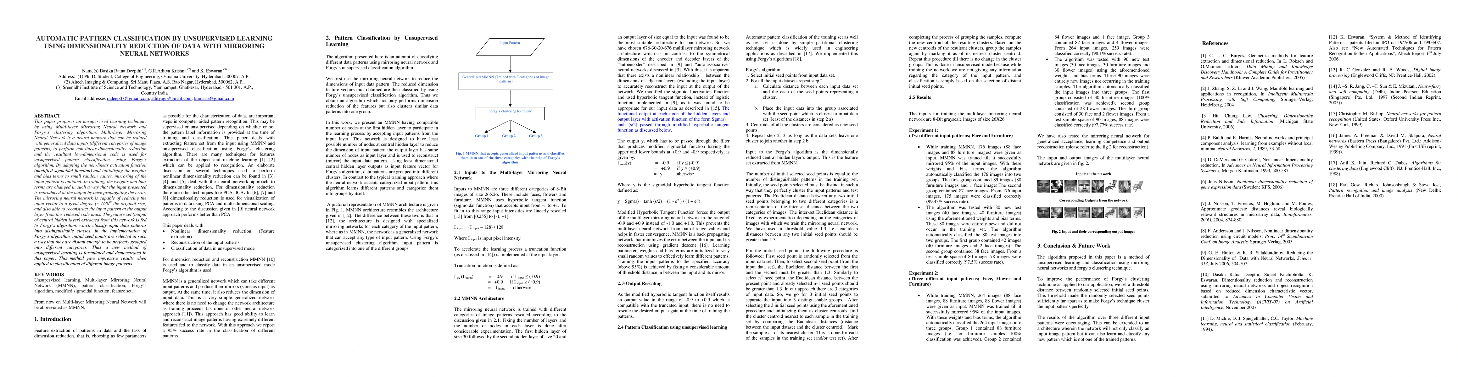 This paper introduces an unsupervised learning method using Multi-layer Mirroring Neural Networks for non-linear dimensionality reduction, followed by Forgy's clustering algorithm for pattern classification, achieving impressive results in image pattern classification.