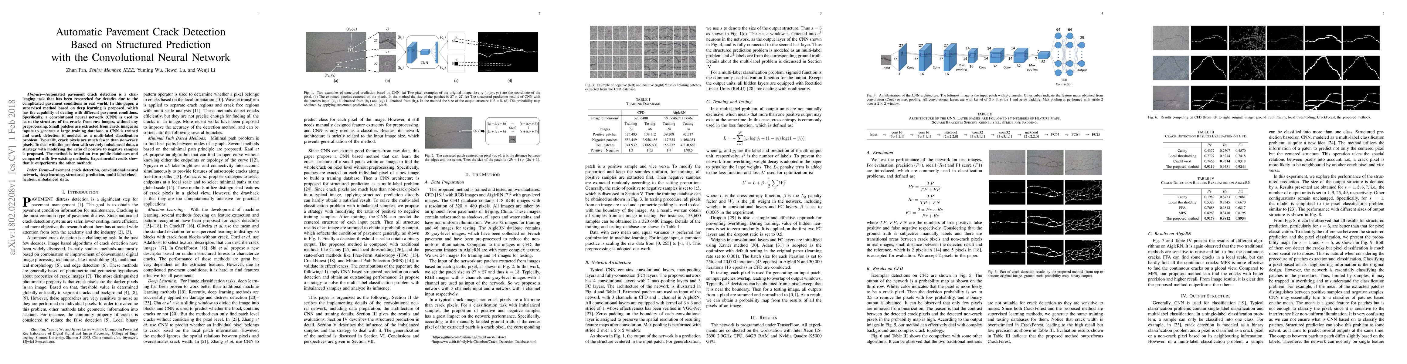 This paper proposes a supervised deep learning method using a convolutional neural network (CNN) for automatic pavement crack detection, directly learning crack structures from raw images. To address data imbalance, a strategy is employed to modify the ratio of positive to negative samples, and the method outperforms five existing methods on public datasets.
