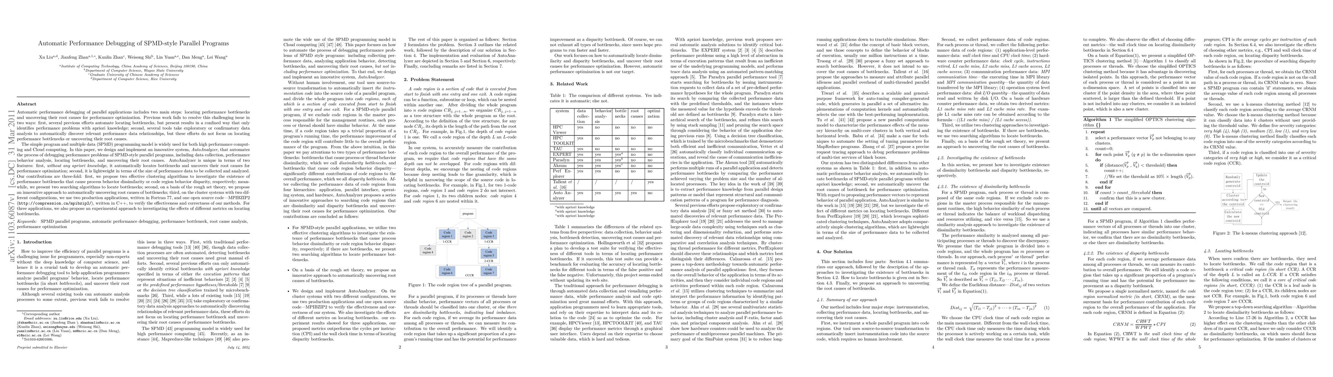 This paper introduces AutoAnalyzer, an automated system for debugging performance issues in SPMD-style parallel programs, featuring automatic bottleneck detection and root cause analysis without prior knowledge. The system employs clustering and searching algorithms, and is validated on two Fortran and one C++ application, demonstrating its effectiveness.