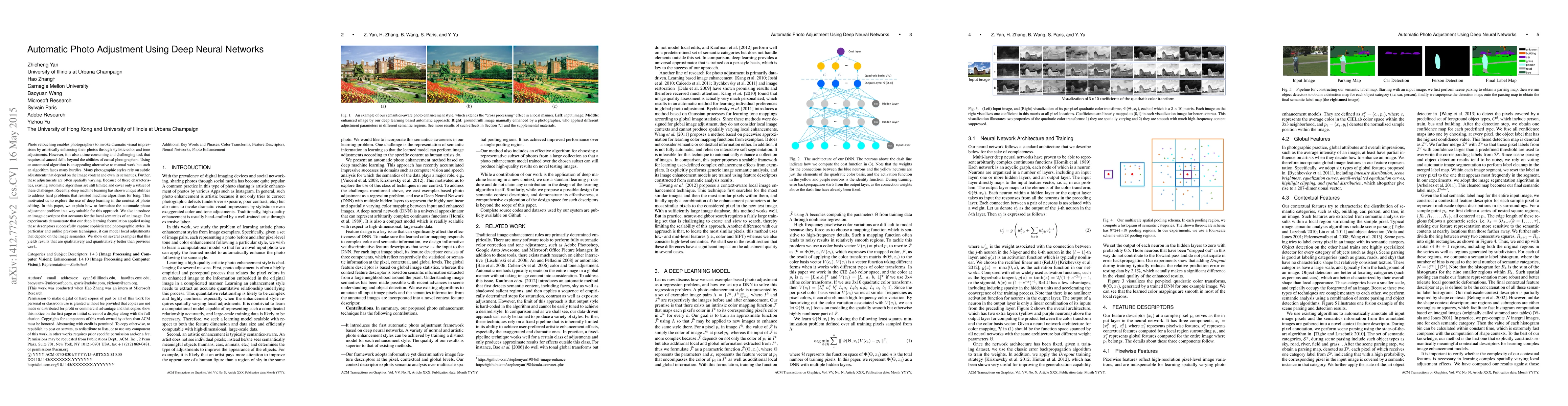 This paper proposes a deep learning approach for automatic photo adjustment, utilizing an image descriptor that captures local semantics to model spatially varying adjustments. Experiments show that the method can achieve sophisticated photographic styles with better local adjustments compared to previous techniques.