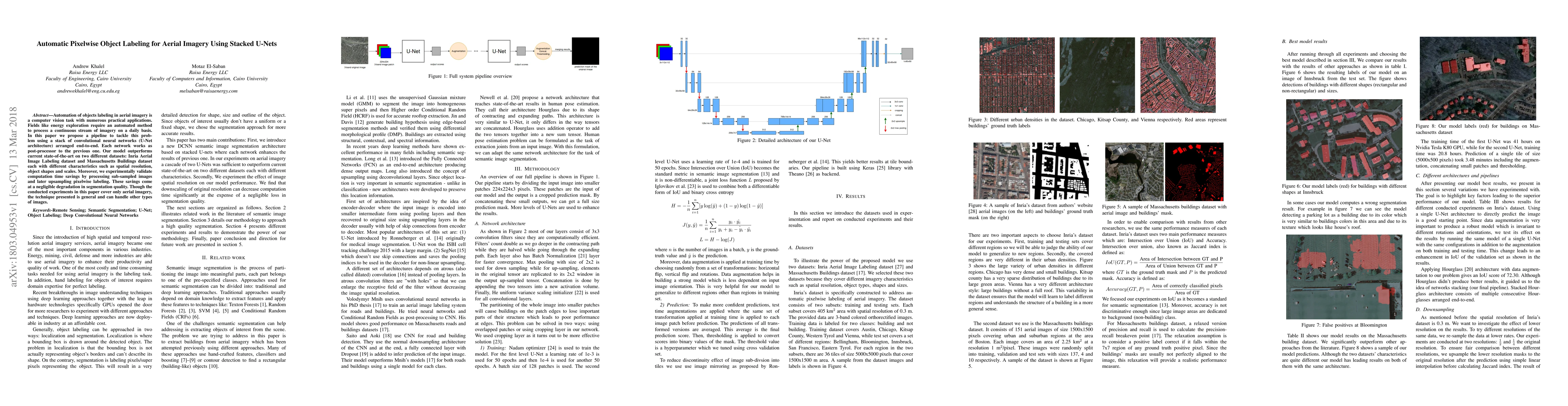 Automation of objects labeling in aerial imagery is a computer vision task with numerous practical applications. Fields like energy exploration require an automated method to process a continuous stream of imagery on a daily basis. In this paper we propose a pipeline to tackle this problem using a stack of convolutional neural networks (U-Net architecture) arranged end-to-end. Each network works as post-processor to the previous one. Our model outperforms current state-of-the-art on two different datasets: Inria Aerial Image Labeling dataset and Massachusetts Buildings dataset each with different characteristics such as spatial resolution, object shapes and scales. Moreover, we experimentally validate computation time savings by processing sub-sampled images and later upsampling pixelwise labeling. These savings come at a negligible degradation in segmentation quality. Though the conducted experiments in this paper cover only aerial imagery, the technique presented is general and can handle other types of images.