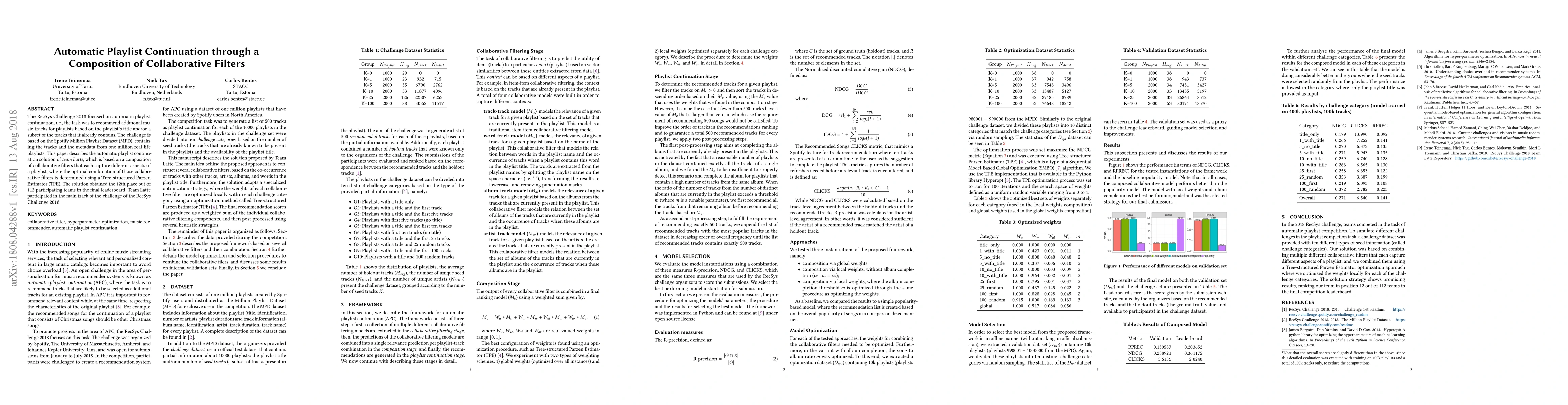 The RecSys Challenge 2018 focused on automatic playlist continuation, i.e., the task was to recommend additional music tracks for playlists based on the playlist's title and/or a subset of the tracks that it already contains. The challenge is based on the Spotify Million Playlist Dataset (MPD), containing the tracks and the metadata from one million real-life playlists. This paper describes the automatic playlist continuation solution of team Latte, which is based on a composition of collaborative filters that each capture different aspects of a playlist, where the optimal combination of those collaborative filters is determined using a Tree-structured Parzen Estimator (TPE). The solution obtained the 12th place out of 112 participating teams in the final leaderboard. Team Latte participated in the main track of the challenge of the RecSys Challenge 2018.