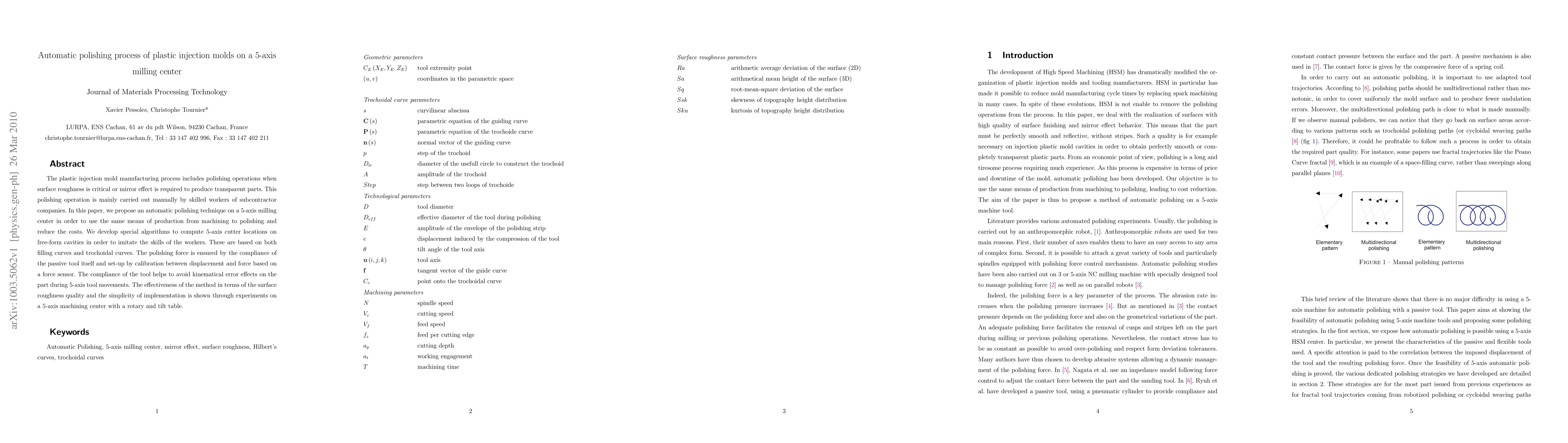 This paper proposes an automatic polishing technique on a 5-axis milling center to replace manual polishing in plastic injection molds, aiming to reduce costs and improve consistency. Special algorithms based on filling and trochoidal curves are developed to compute cutter locations and ensure polishing force through tool compliance.