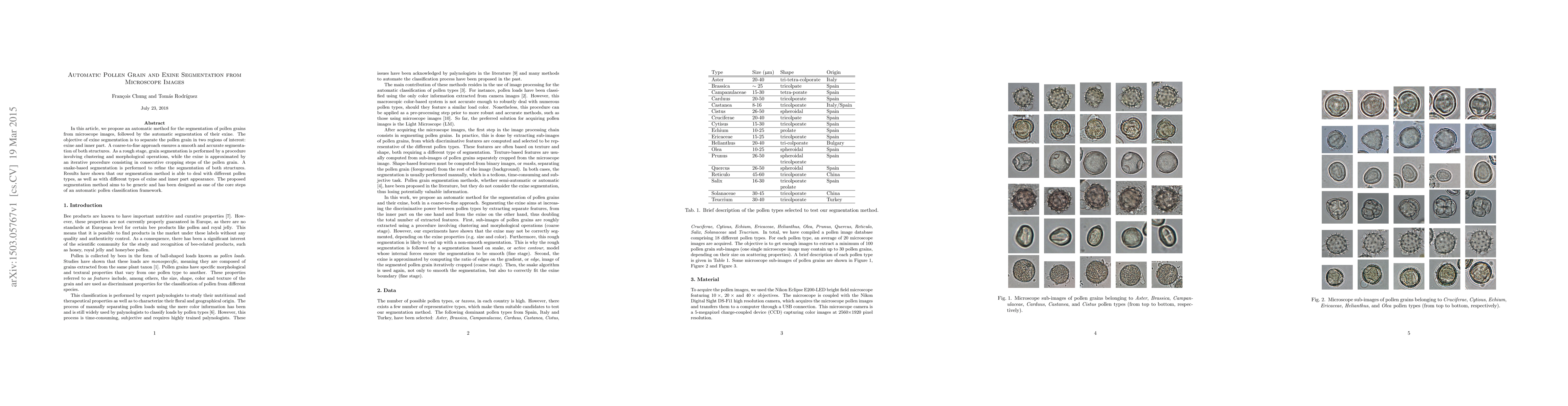 This paper presents an automatic method for segmenting pollen grains and their exine from microscope images, employing a coarse-to-fine approach that combines clustering, morphological operations, and snake-based refinement to achieve accurate segmentation. The method aims to support automatic pollen classification.