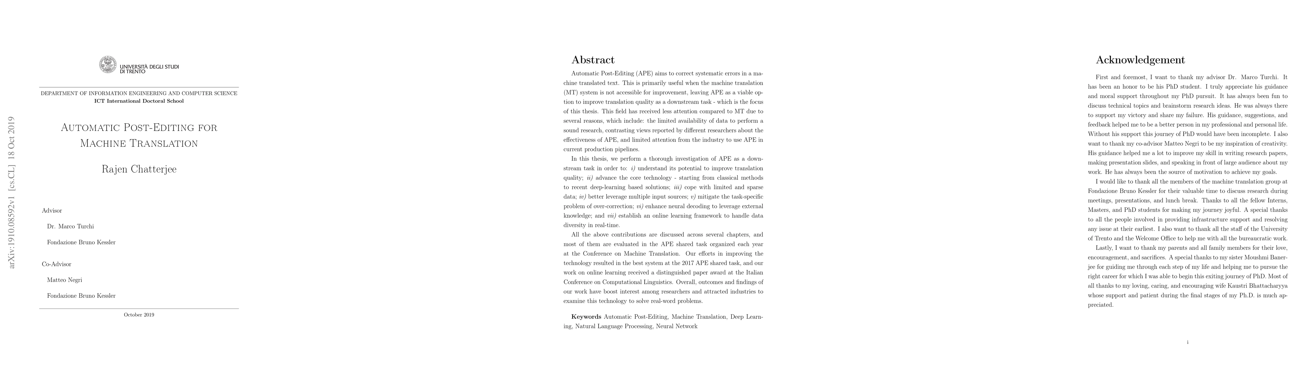 This research investigates Automatic Post-Editing (APE) as a downstream task to enhance machine translation (MT) quality by correcting systematic errors, especially when MT systems cannot be improved directly. The study aims to advance APE technology, tackle data limitations, and develop frameworks for real-time learning, culminating in the best system at the 2017 APE shared task and a distinguished award for online learning research.