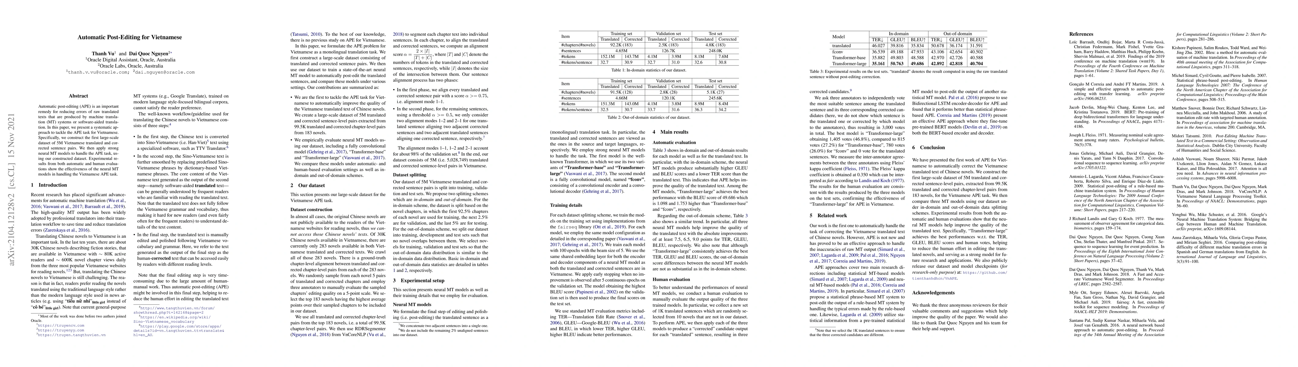 This paper presents a systematic approach for automatic post-editing (APE) of Vietnamese machine translation outputs, utilizing a newly constructed dataset of 5 million corrected sentence pairs. The study employs neural machine translation models, demonstrating their effectiveness through both automatic and human evaluations.