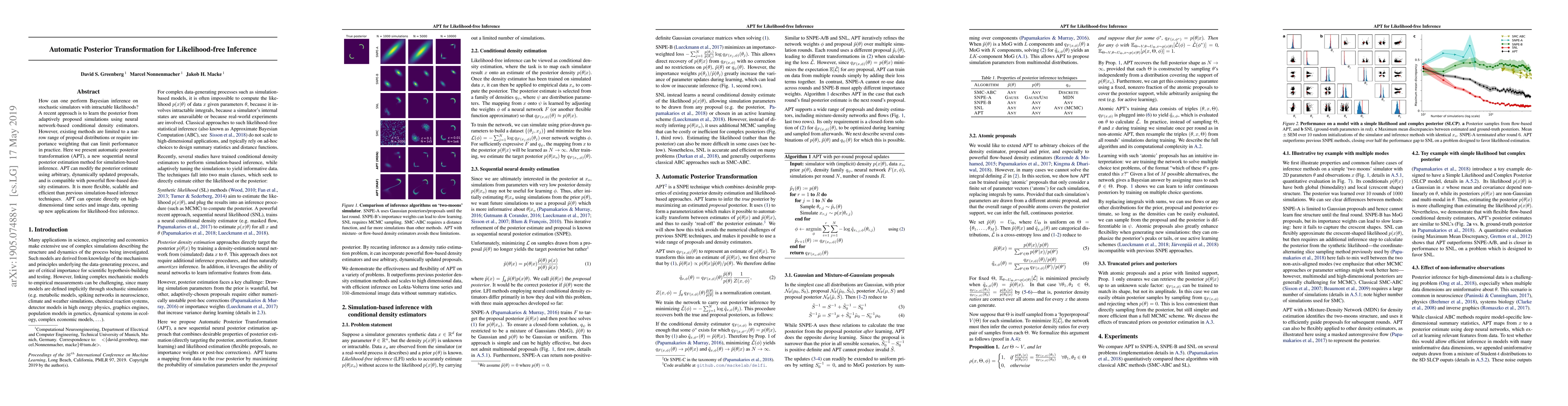 How can one perform Bayesian inference on stochastic simulators with intractable likelihoods? A recent approach is to learn the posterior from adaptively proposed simulations using neural network-based conditional density estimators. However, existing methods are limited to a narrow range of proposal distributions or require importance weighting that can limit performance in practice. Here we present automatic posterior transformation (APT), a new sequential neural posterior estimation method for simulation-based inference. APT can modify the posterior estimate using arbitrary, dynamically updated proposals, and is compatible with powerful flow-based density estimators. It is more flexible, scalable and efficient than previous simulation-based inference techniques. APT can operate directly on high-dimensional time series and image data, opening up new applications for likelihood-free inference.