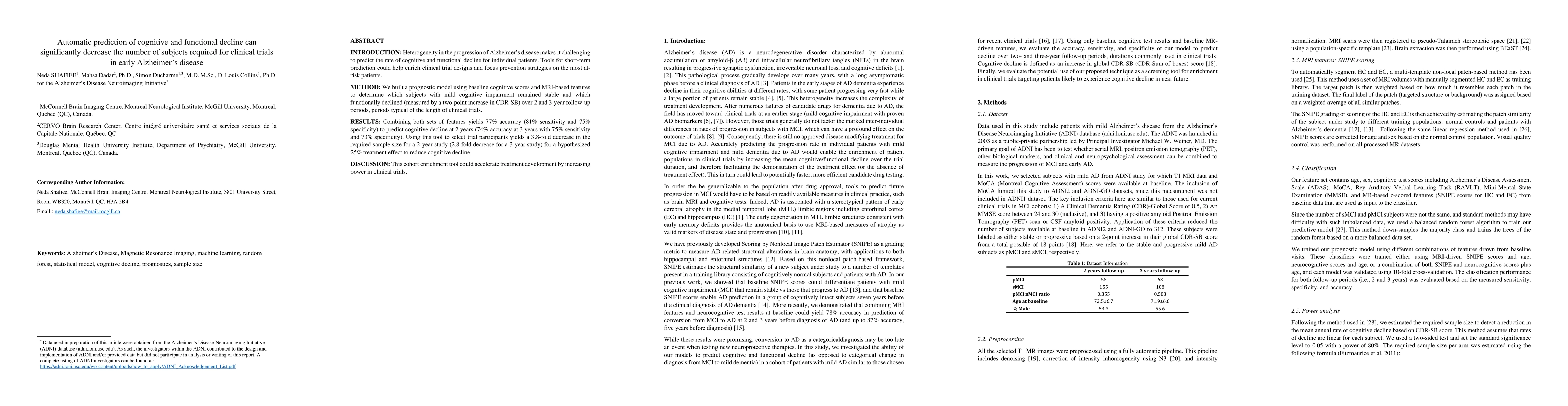 This study developed a predictive model to forecast cognitive and functional decline in early Alzheimer's patients, achieving 77% accuracy over 2 years and 74% over 3 years. Using this tool to select trial participants reduces the required sample size by 3.8-fold for 2-year studies, potentially speeding up treatment development.
