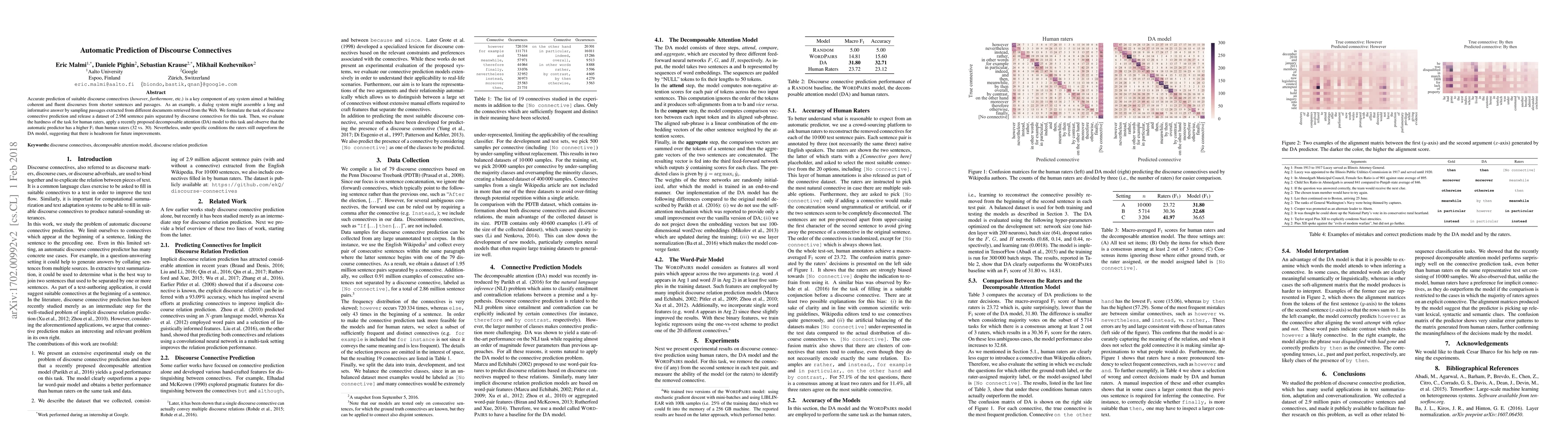 This research investigates the automatic prediction of discourse connectives to create coherent texts, presenting a dataset of 2.9 million sentence pairs. A decomposable attention model is used, which outperforms human raters in F1 score (32 vs. 30), though humans still excel under certain conditions, indicating potential for further enhancements.