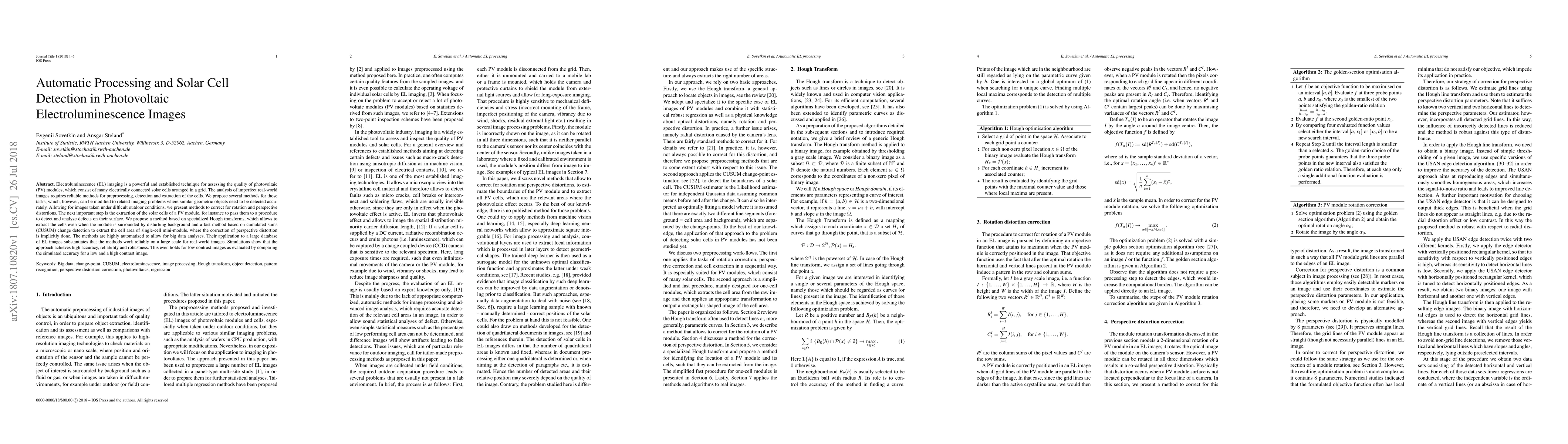 This paper proposes automated methods for preprocessing, detecting, and extracting solar cells in photovoltaic electroluminescence images, focusing on correcting distortions and accurately identifying cells even under challenging conditions. The methods include specialized Hough transforms and CUSUM change detection, demonstrating high accuracy and robustness in large-scale real-world applications.