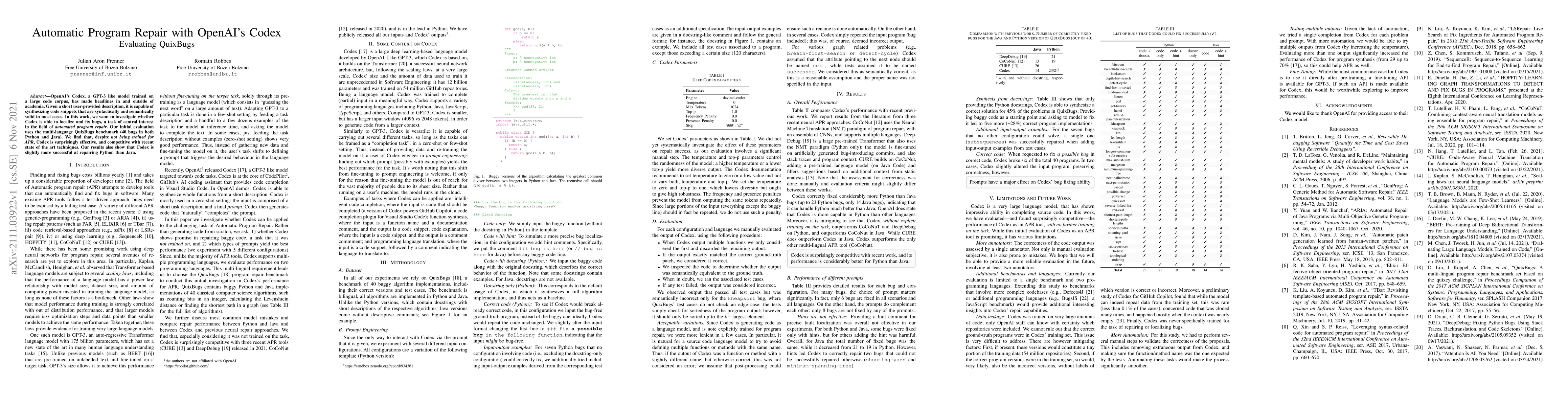 This study evaluates the effectiveness of Codex, a large code model by OpenAI, in automatically repairing bugs using the QuixBugs benchmark. Despite not being specifically trained for automated program repair, Codex shows competitive performance, especially in fixing Python bugs compared to Java.