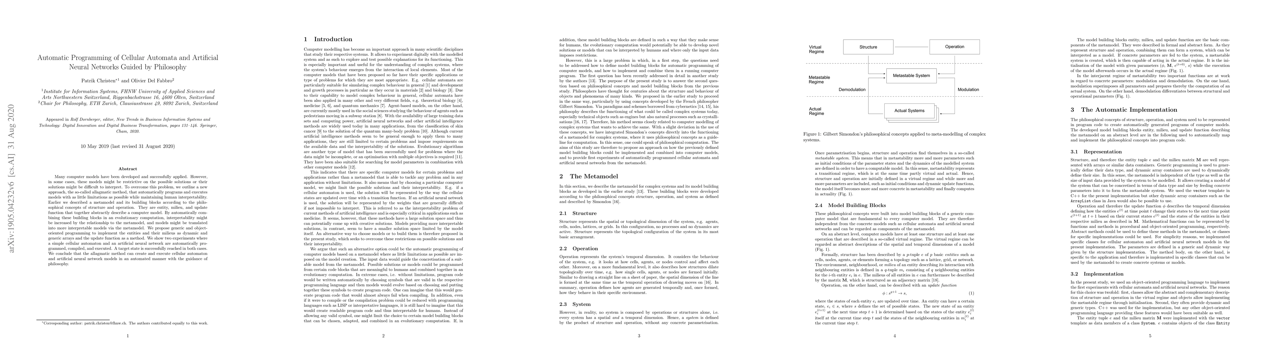 Many computer models such as cellular automata and artificial neural networks have been developed and successfully applied. However, in some cases, these models might be restrictive on the possible solutions or their solutions might be difficult to interpret. To overcome this problem, we outline a new approach, the so-called allagmatic method, that automatically programs and executes models with as little limitations as possible while maintaining human interpretability. Earlier we described a metamodel and its building blocks according to the philosophical concepts of structure (spatial dimension) and operation (temporal dimension). They are entity, milieu, and update function that together abstractly describe cellular automata, artificial neural networks, and possibly any kind of computer model. By automatically combining these building blocks in an evolutionary computation, interpretability might be increased by the relationship to the metamodel, and models might be translated into more interpretable models via the metamodel. We propose generic and object-oriented programming to implement the entities and their milieus as dynamic and generic arrays and the update function as a method. We show two experiments where a simple cellular automaton and an artificial neural network are automatically programmed, compiled, and executed. A target state is successfully evolved and learned in the cellular automaton and artificial neural network, respectively. We conclude that the allagmatic method can create and execute cellular automaton and artificial neural network models in an automated manner with the guidance of philosophy.