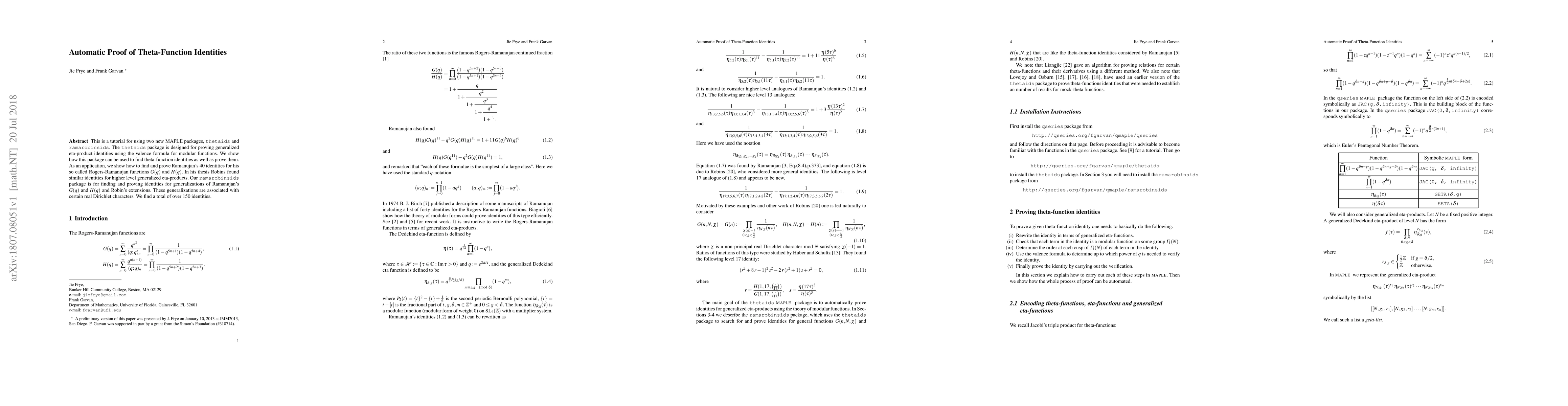 This is a tutorial for using two new MAPLE packages, thetaids and ramarobinsids. The thetaids package is designed for proving generalized eta-product identities using the valence formula for modular functions. We show how this package can be used to find theta-function identities as well as prove them. As an application, we show how to find and prove Ramanujan's 40 identities for his so called Rogers-Ramanujan functions G(q) and H(q). In his thesis Robins found similar identities for higher level generalized eta-products. Our ramarobinsids package is for finding and proving identities for generalizations of Ramanujan's G(q) and H(q) and Robin's extensions. These generalizations are associated with certain real Dirichlet characters. We find a total of over 150 identities.