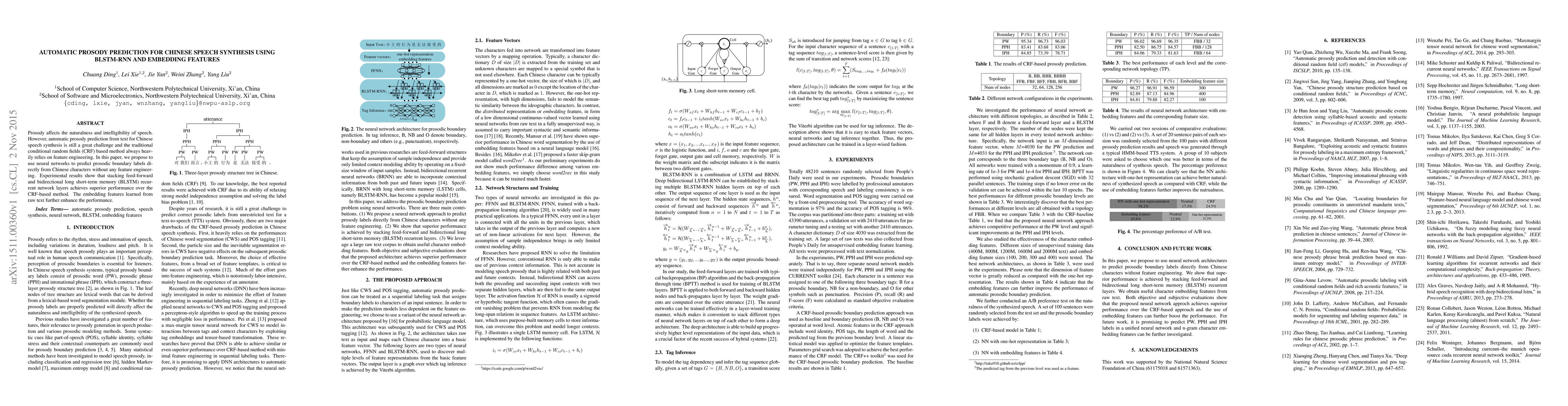This paper proposes a neural network approach using BLSTM-RNN and embedding features for automatic prosody prediction in Chinese speech synthesis, achieving better performance than traditional CRF-based methods. The model directly predicts prosodic boundary labels from Chinese characters without feature engineering.