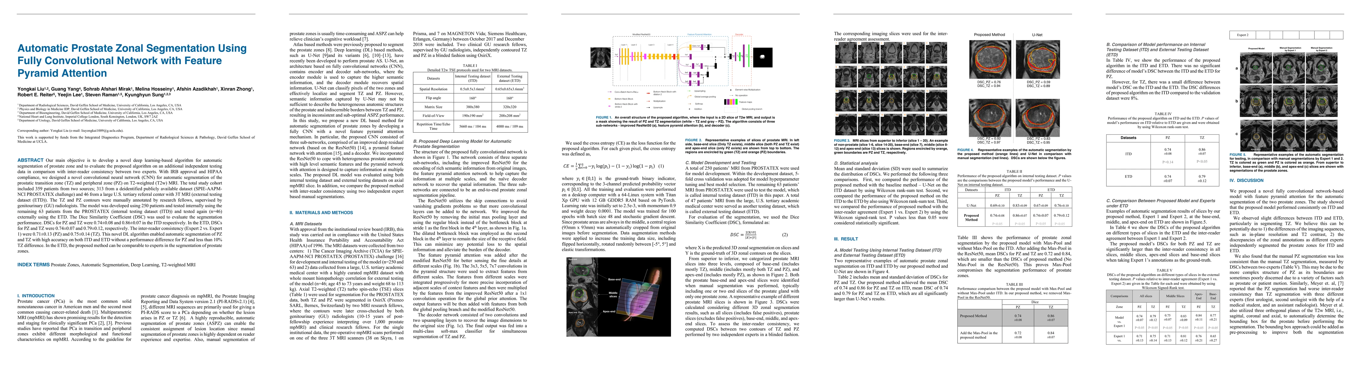 Our main objective is to develop a novel deep learning-based algorithm for automatic segmentation of prostate zone and to evaluate the proposed algorithm on an additional independent testing data in comparison with inter-reader consistency between two experts. With IRB approval and HIPAA compliance, we designed a novel convolutional neural network (CNN) for automatic segmentation of the prostatic transition zone (TZ) and peripheral zone (PZ) on T2-weighted (T2w) MRI. The total study cohort included 359 patients from two sources; 313 from a deidentified publicly available dataset (SPIE-AAPM-NCI PROSTATEX challenge) and 46 from a large U.S. tertiary referral center with 3T MRI (external testing dataset (ETD)). The TZ and PZ contours were manually annotated by research fellows, supervised by genitourinary (GU) radiologists. The model was developed using 250 patients and tested internally using the remaining 63 patients from the PROSTATEX (internal testing dataset (ITD)) and tested again (n=46) externally using the ETD. The Dice Similarity Coefficient (DSC) was used to evaluate the segmentation performance. DSCs for PZ and TZ were 0.74 and 0.86 in the ITD respectively. In the ETD, DSCs for PZ and TZ were 0.74 and 0.792, respectively. The inter-reader consistency (Expert 2 vs. Expert 1) were 0.71 (PZ) and 0.75 (TZ). This novel DL algorithm enabled automatic segmentation of PZ and TZ with high accuracy on both ITD and ETD without a performance difference for PZ and less than 10% TZ difference. In the ETD, the proposed method can be comparable to experts in the segmentation of prostate zones.
