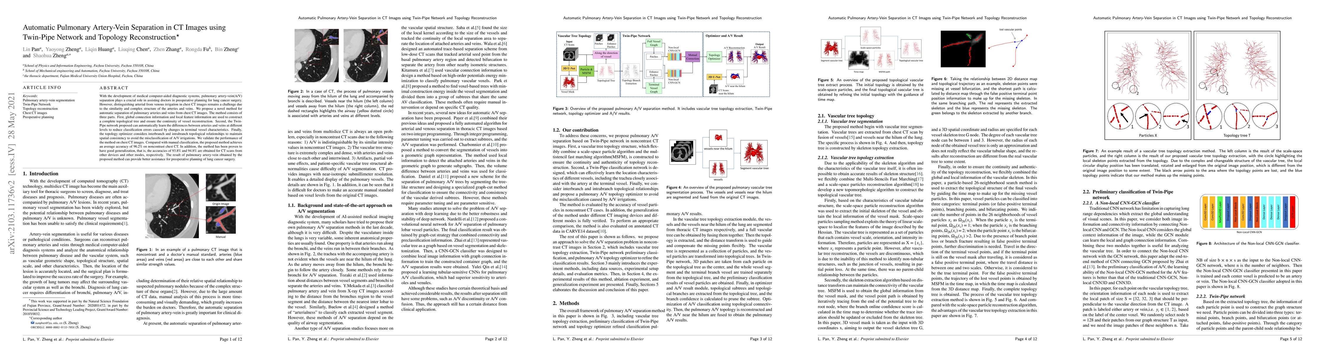 This paper proposes a novel Twin-Pipe network method for automatic separation of pulmonary arteries and veins in chest CT images, achieving an average accuracy of 96.2%. The method integrates global connectivity, local features, and topology optimization to maintain spatial consistency and reduce classification errors.