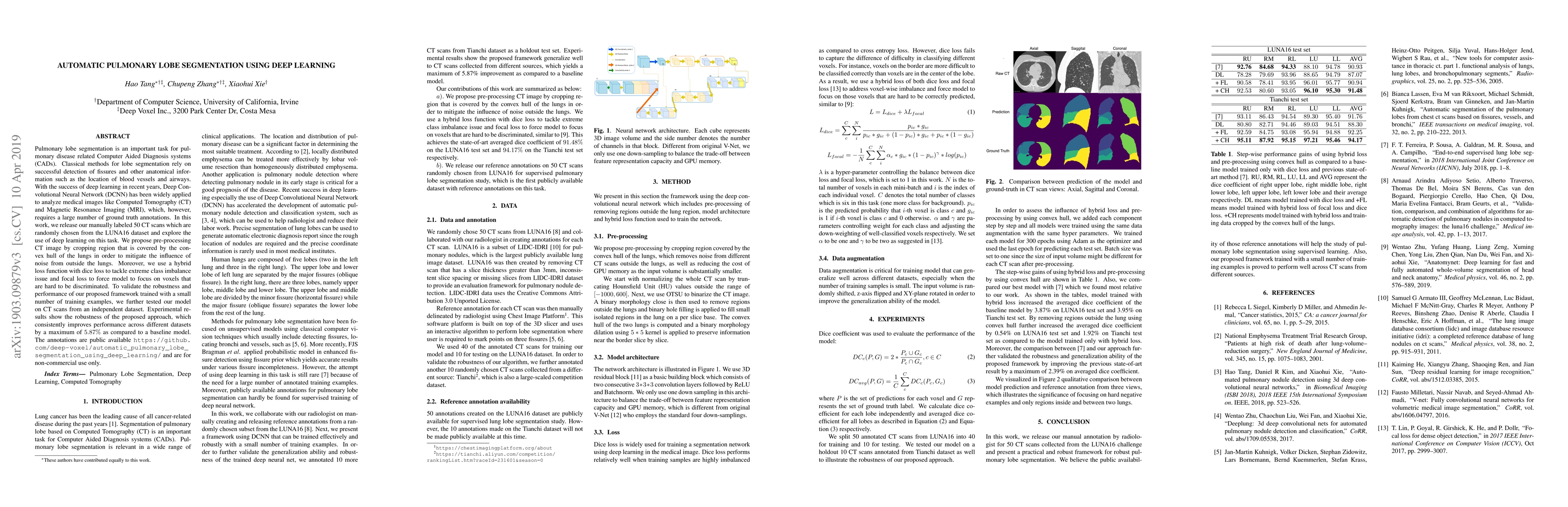 Pulmonary lobe segmentation is an important task for pulmonary disease related Computer Aided Diagnosis systems (CADs). Classical methods for lobe segmentation rely on successful detection of fissures and other anatomical information such as the location of blood vessels and airways. With the success of deep learning in recent years, Deep Convolutional Neural Network (DCNN) has been widely applied to analyze medical images like Computed Tomography (CT) and Magnetic Resonance Imaging (MRI), which, however, requires a large number of ground truth annotations. In this work, we release our manually labeled 50 CT scans which are randomly chosen from the LUNA16 dataset and explore the use of deep learning on this task. We propose pre-processing CT image by cropping region that is covered by the convex hull of the lungs in order to mitigate the influence of noise from outside the lungs. Moreover, we design a hybrid loss function with dice loss to tackle extreme class imbalance issue and focal loss to force model to focus on voxels that are hard to be discriminated. To validate the robustness and performance of our proposed framework trained with a small number of training examples, we further tested our model on CT scans from an independent dataset. Experimental results show the robustness of the proposed approach, which consistently improves performance across different datasets by a maximum of $5.87\%$ as compared to a baseline model.