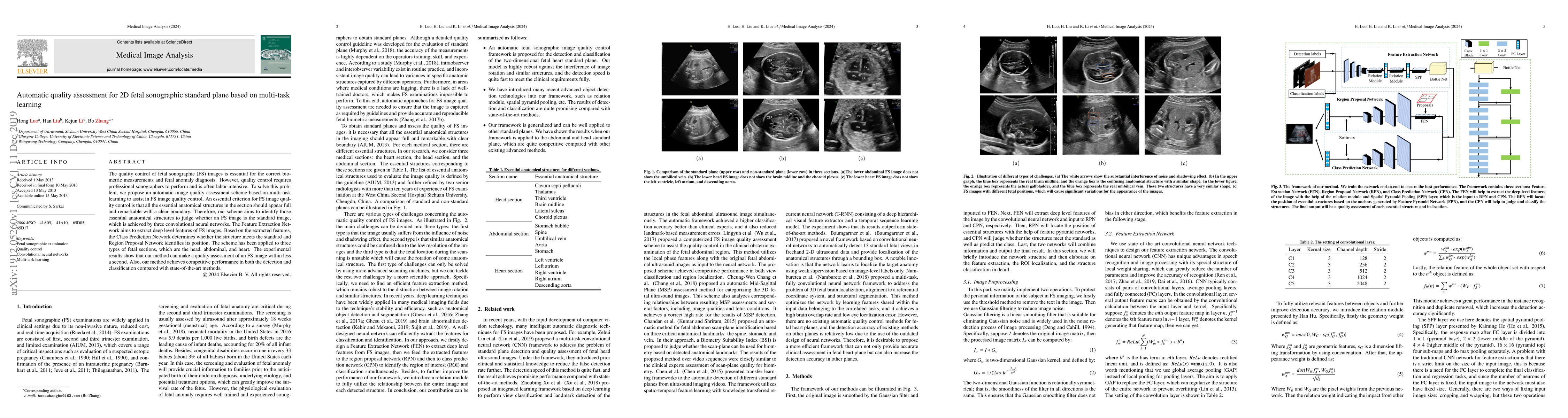 This paper proposes an automatic quality assessment system for 2D fetal sonographic images using multi-task learning, aiming to identify essential anatomical structures for accurate diagnosis. The system employs three convolutional neural networks to extract features, classify structures, and locate regions, achieving competitive performance against state-of-the-art methods.