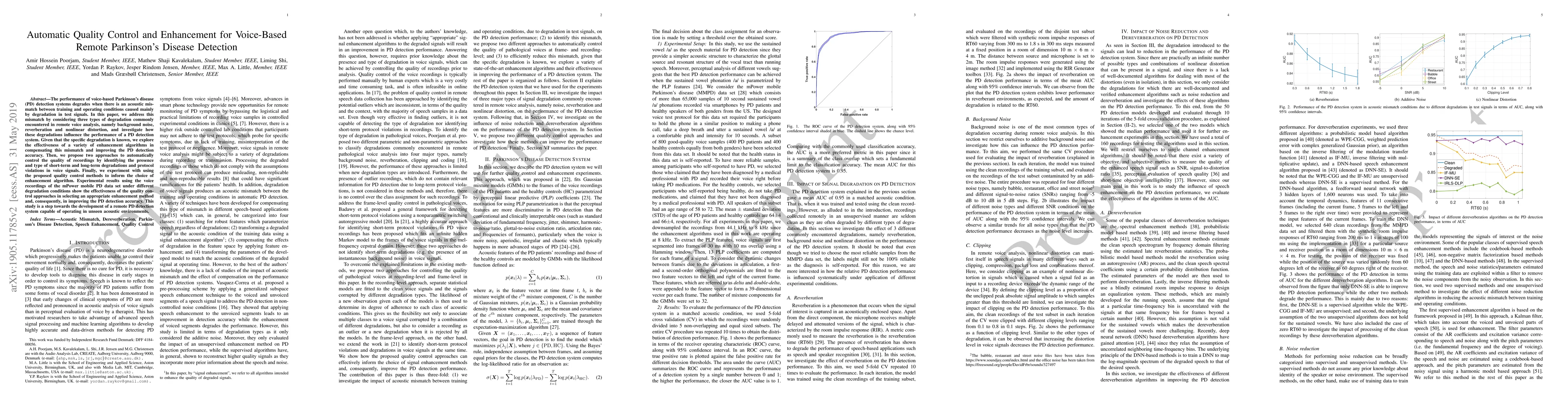 This paper proposes automatic quality control and enhancement methods to improve the accuracy of voice-based remote Parkinson's disease detection systems, addressing issues like background noise, reverberation, and nonlinear distortion. The study demonstrates that these methods can effectively select appropriate enhancement algorithms, thereby improving PD detection accuracy in unseen acoustic environments.