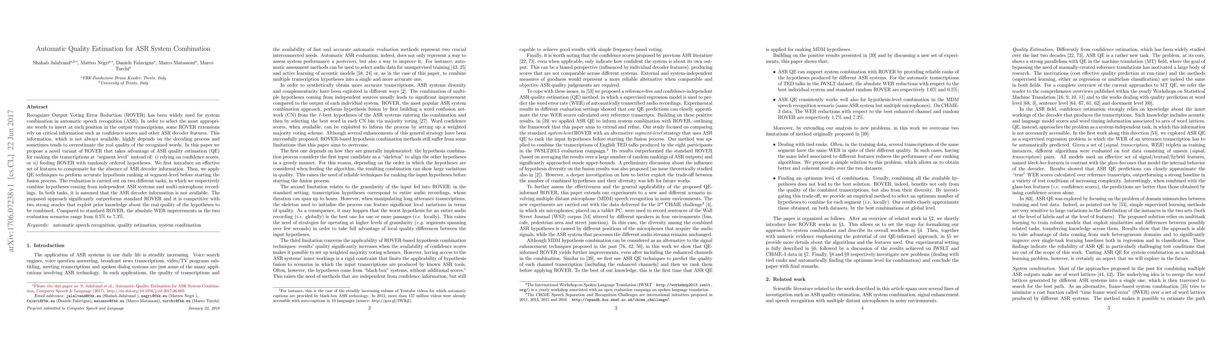 A new approach to automatic quality estimation for ASR system combination improves performance by using segment-level ranking and reducing reliance on unavailable decoder information, leading to significant WER reductions of 0.5-7.3% compared to standard ROVER.