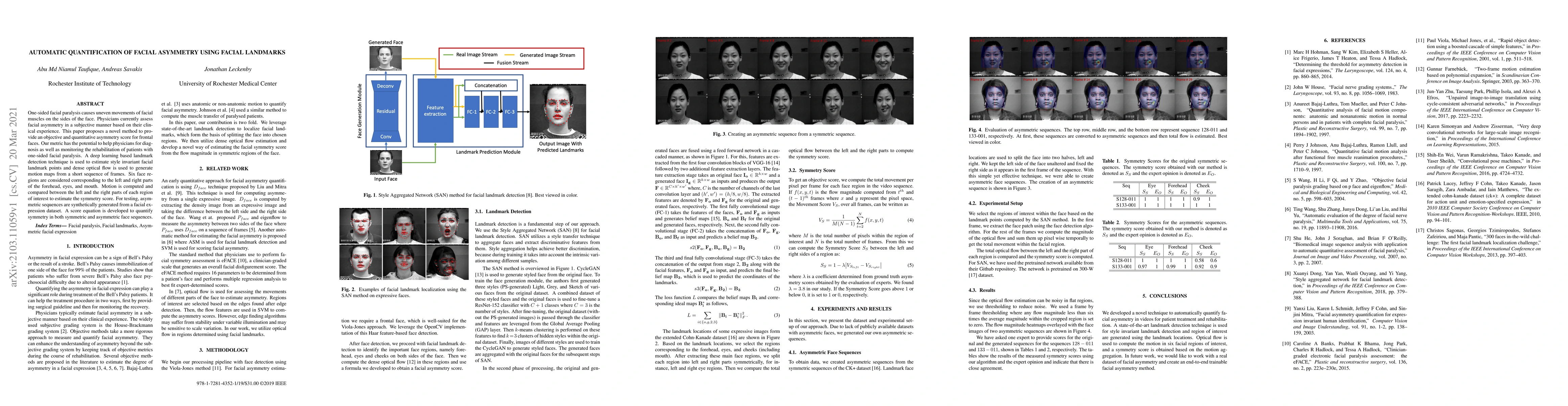 One-sided facial paralysis causes uneven movements of facial muscles on the sides of the face. Physicians currently assess facial asymmetry in a subjective manner based on their clinical experience. This paper proposes a novel method to provide an objective and quantitative asymmetry score for frontal faces. Our metric has the potential to help physicians for diagnosis as well as monitoring the rehabilitation of patients with one-sided facial paralysis. A deep learning based landmark detection technique is used to estimate style invariant facial landmark points and dense optical flow is used to generate motion maps from a short sequence of frames. Six face regions are considered corresponding to the left and right parts of the forehead, eyes, and mouth. Motion is computed and compared between the left and the right parts of each region of interest to estimate the symmetry score. For testing, asymmetric sequences are synthetically generated from a facial expression dataset. A score equation is developed to quantify symmetry in both symmetric and asymmetric face sequences.