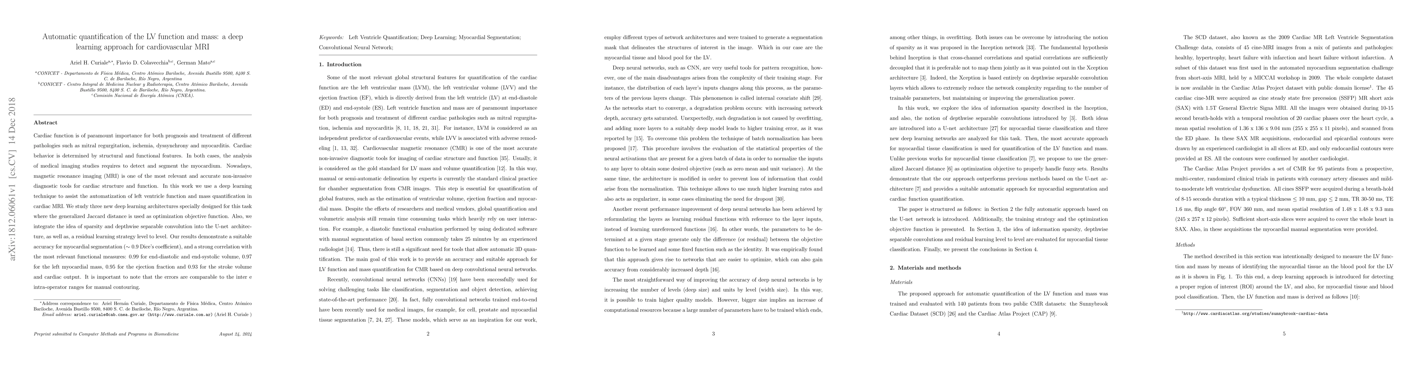 Objective: This paper proposes a novel approach for automatic left ventricle (LV) quantification using convolutional neural networks (CNN). Methods: The general framework consists of one CNN for detecting the LV, and another for tissue classification. Also, three new deep learning architectures were proposed for LV quantification. These new CNNs introduce the ideas of sparsity and depthwise separable convolution into the U-net architecture, as well as, a residual learning strategy level-to-level. To this end, we extend the classical U-net architecture and use the generalized Jaccard distance as optimization objective function. Results: The CNNs were trained and evaluated with 140 patients from two public cardiovascular magnetic resonance datasets (Sunnybrook and Cardiac Atlas Project) by using a 5-fold cross-validation strategy. Our results demonstrate a suitable accuracy for myocardial segmentation ($\sim$0.9 Dice's coefficient), and a strong correlation with the most relevant physiological measures: 0.99 for end-diastolic and end-systolic volume, 0.97 for the left myocardial mass, 0.95 for the ejection fraction and 0.93 for the stroke volume and cardiac output. Conclusion: Our simulation and clinical evaluation results demonstrate the capability and merits of the proposed CNN to estimate different structural and functional features such as LV mass and EF which are commonly used for both diagnosis and treatment of different pathologies. Significance: This paper suggests a new approach for automatic LV quantification based on deep learning where errors are comparable to the inter- and intra-operator ranges for manual contouring. Also, this approach may have important applications on motion quantification.