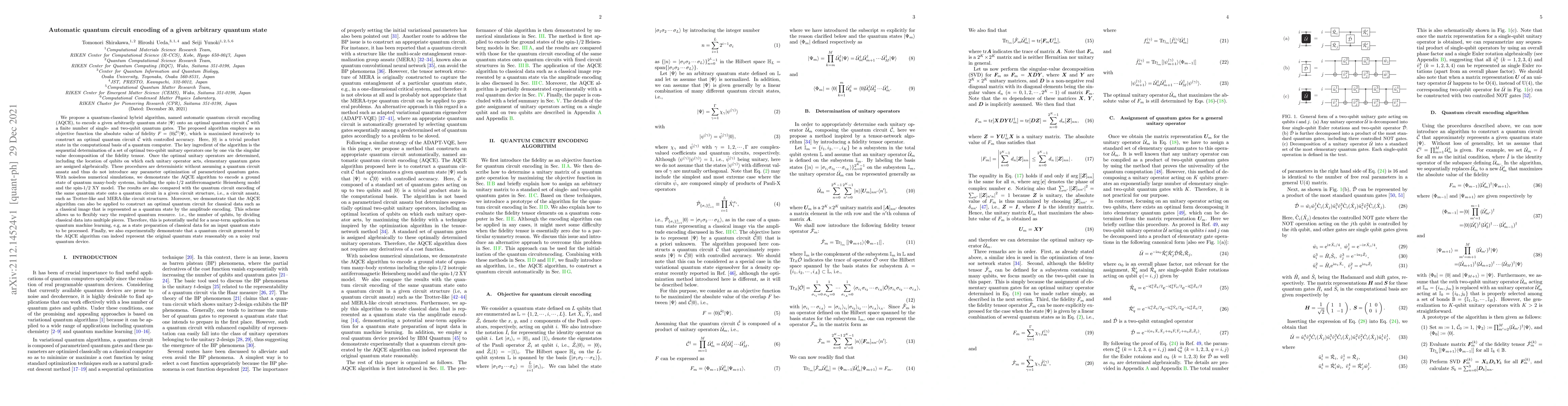 We propose a quantum-classical hybrid algorithm to encode a given arbitrarily quantum state $\vert \Psi \rangle$ onto an optimal quantum circuit $\hat{\mathcal{C}}$ with a finite number of single- and two-qubit quantum gates. The proposed algorithm employs as an objective function the absolute value of fidelity $F = \langle 0 \vert \hat{\mathcal{C}}^{\dagger} \vert \Psi \rangle$, which is maximized iteratively to construct an optimal quantum circuit $\hat{\mathcal{C}}$ with controlled accuracy. The key ingredient of the algorithm is the sequential determination of a set of optimal two-qubit unitary operators one by one via the singular value decomposition of the fidelity tensor. Once the optimal unitary operators are determined, including the location of qubits on which each unitary operator acts, elementary quantum gates are assigned algebraically. With noiseless numerical simulations, we demonstrate the algorithm to encode a ground state of quantum many-body systems, including the spin-1/2 antiferromagnetic Heisenberg model and the spin-1/2 XY model. The results are also compared with the quantum circuit encoding of the same quantum state onto a quantum circuit in a given circuit structure. Moreover, we demonstrate that the algorithm can also be applied to construct an optimal quantum circuit for classical data such as a classical image that is represented as a quantum state by the amplitude encoding. Finally, we also experimentally demonstrate that a quantum circuit generated by the AQCE algorithm can indeed represent the original quantum state reasonably on a noisy real quantum device.