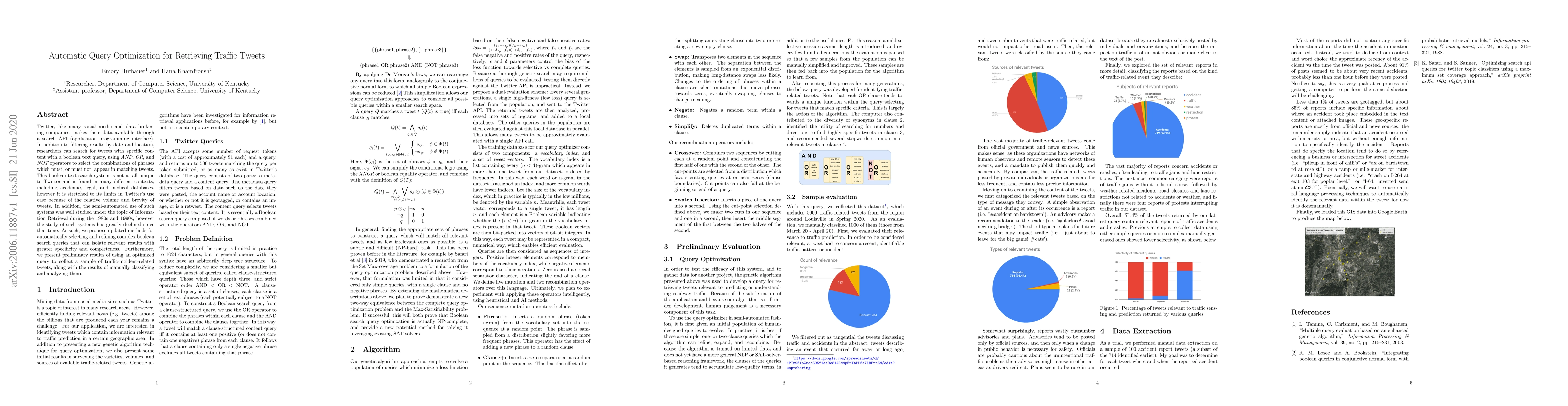 Researchers developed a method to automatically optimize search queries on Twitter for retrieving traffic-related tweets with greater specificity and completeness. They presented preliminary results of using their optimized query and manually classified and analyzed the collected tweets.