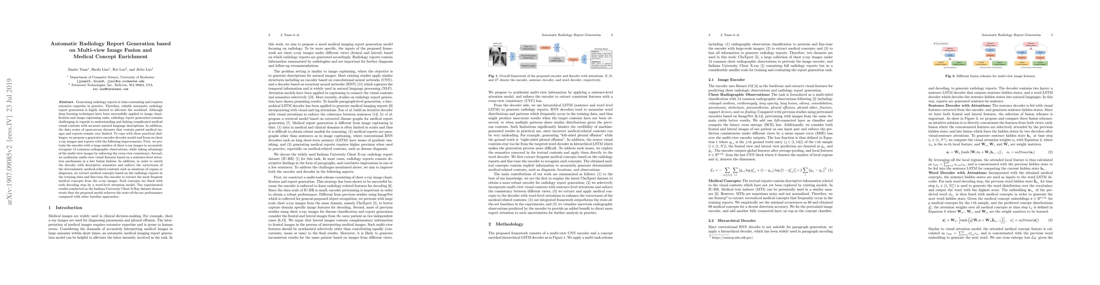 This paper proposes a generative encoder-decoder model for automatic radiology report generation from chest x-ray images, utilizing multi-view image fusion and medical concept enrichment. The model achieves state-of-the-art performance by pretraining on large chest x-ray datasets and incorporating a sentence-level attention mechanism for feature synthesis.