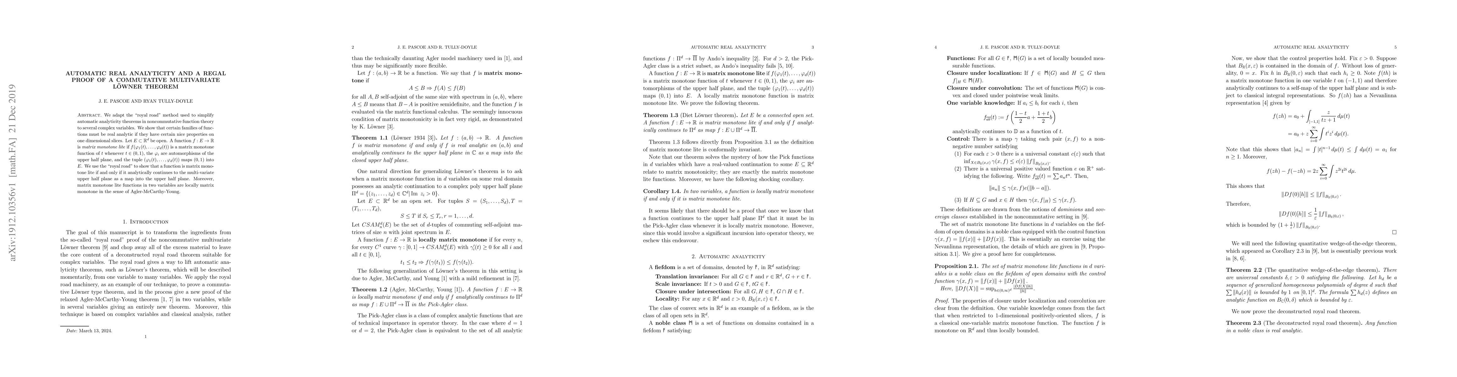 We adapt the "royal road" method used to simplify automatic analyticity theorems in noncommutative function theory to several complex variables. We show that certain families of functions must be real analytic if they have certain nice properties on one dimensional slices. Let $E \subset \mathbb{R}^d$ be open. A function $f:E \to \mathbb{R}$ is matrix monotone lite if $f(\varphi_1(t), \ldots, \varphi_d(t))$ is a matrix monotone function of $t$ whenever $t \in (0,1)$, the $\varphi_i$ are automorphisms of the upper half plane, and the tuple $(\varphi_1(t), \ldots, \varphi_d(t))$ maps $(0,1)$ into $E$. We use the "royal road" to show that a function is matrix monotone lite if and only if it analytically continues to the multi-variate upper half plane as a map into the upper half plane. Moreover, matrix monotone lite functions in two variables are locally matrix monotone in the sense of Agler-McCarthy-Young.
