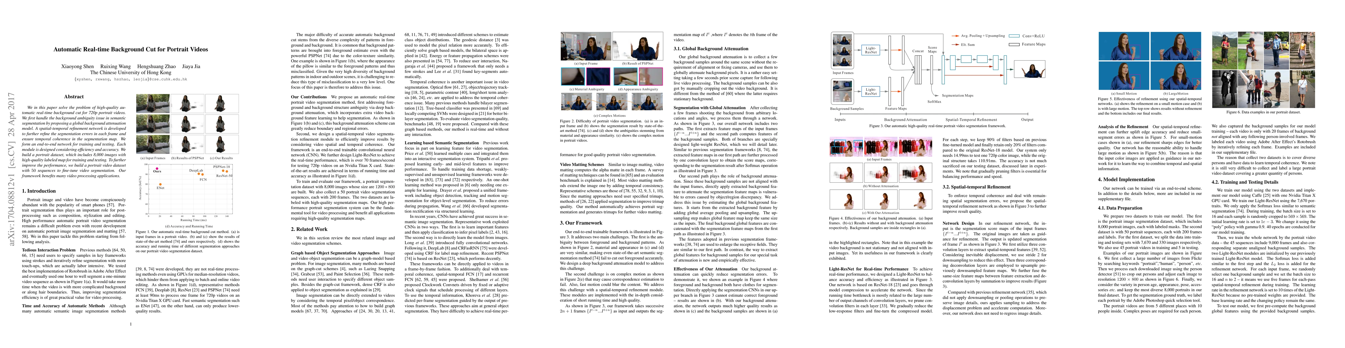 We in this paper solve the problem of high-quality automatic real-time background cut for 720p portrait videos. We first handle the background ambiguity issue in semantic segmentation by proposing a global background attenuation model. A spatial-temporal refinement network is developed to further refine the segmentation errors in each frame and ensure temporal coherence in the segmentation map. We form an end-to-end network for training and testing. Each module is designed considering efficiency and accuracy. We build a portrait dataset, which includes 8,000 images with high-quality labeled map for training and testing. To further improve the performance, we build a portrait video dataset with 50 sequences to fine-tune video segmentation. Our framework benefits many video processing applications.