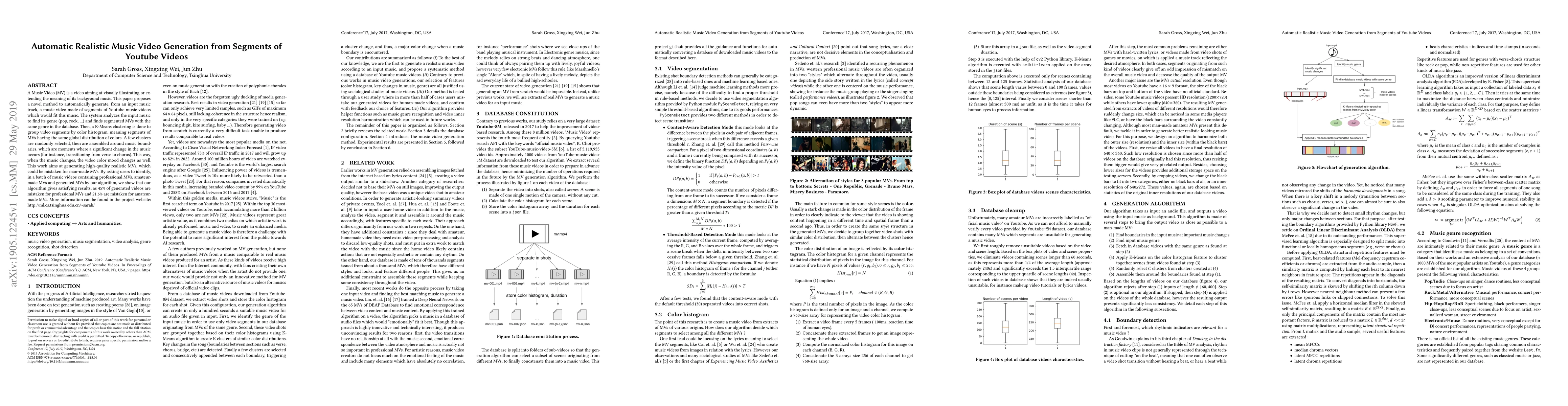 This paper proposes a method to automatically generate realistic music videos by segmenting and reassembling segments from existing YouTube music videos, aligning them with the input music track's genre and significant changes. The results show that 45% of generated videos are mistaken for professional music videos, indicating high-quality output.