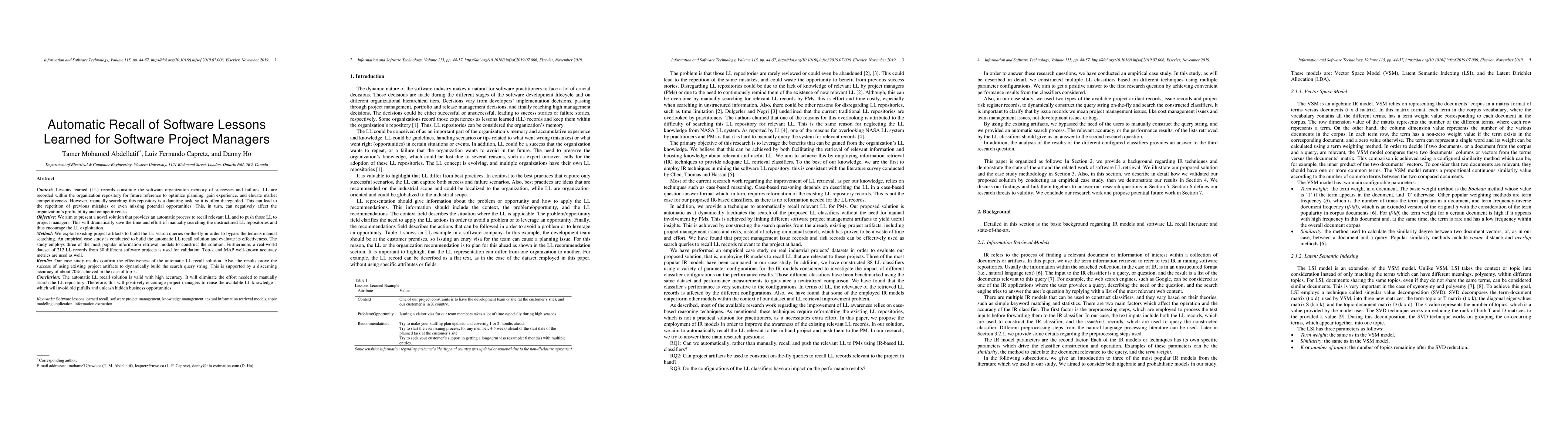 Researchers developed an automatic process to recall lessons learned from software projects, eliminating the need for manual searching, and achieved a 70% accuracy rate in identifying relevant records.