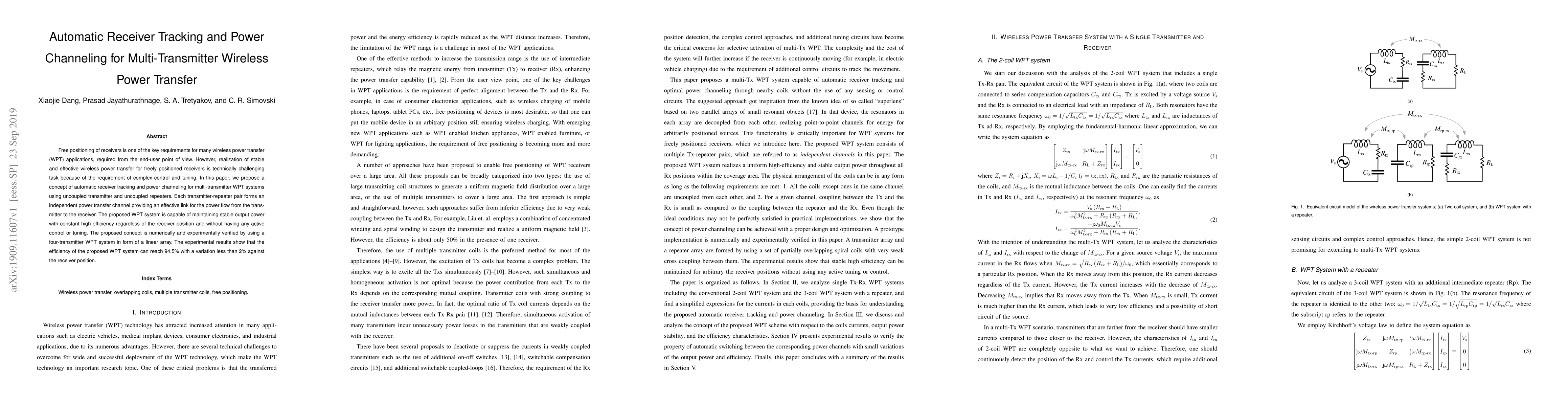 This paper proposes an automatic receiver tracking and power channeling method for multi-transmitter wireless power transfer systems, utilizing uncoupled repeaters to maintain stable output power and high efficiency (94.5% with less than 2% variation) regardless of receiver position, without active control or tuning. The concept is validated through numerical and experimental results using a four-transmitter linear array system.