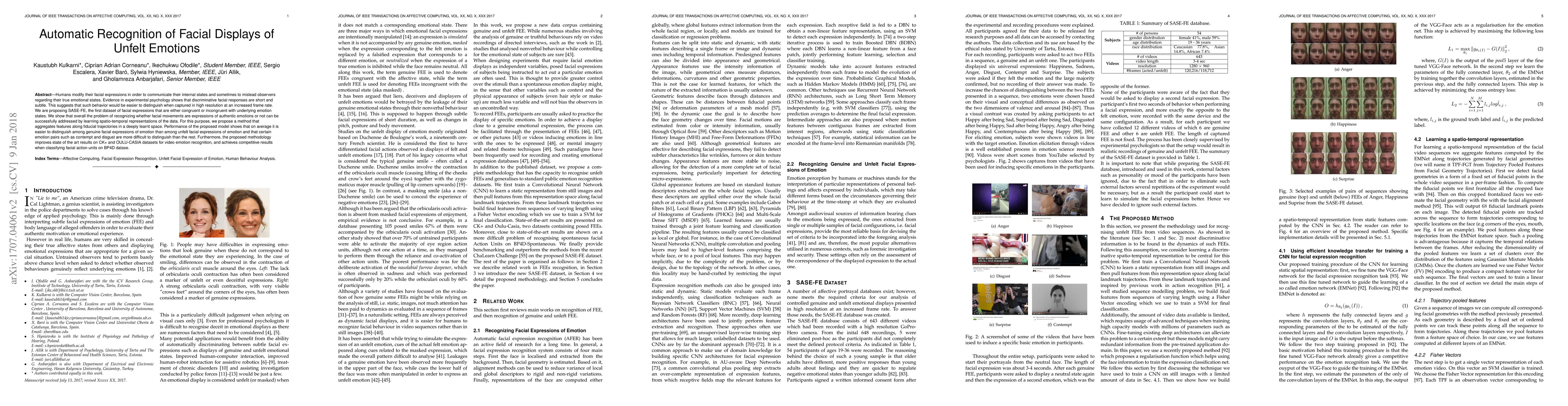 Humans modify their facial expressions in order to communicate their internal states and sometimes to mislead observers regarding their true emotional states. Evidence in experimental psychology shows that discriminative facial responses are short and subtle. This suggests that such behavior would be easier to distinguish when captured in high resolution at an increased frame rate. We are proposing SASE-FE, the first dataset of facial expressions that are either congruent or incongruent with underlying emotion states. We show that overall the problem of recognizing whether facial movements are expressions of authentic emotions or not can be successfully addressed by learning spatio-temporal representations of the data. For this purpose, we propose a method that aggregates features along fiducial trajectories in a deeply learnt space. Performance of the proposed model shows that on average it is easier to distinguish among genuine facial expressions of emotion than among unfelt facial expressions of emotion and that certain emotion pairs such as contempt and disgust are more difficult to distinguish than the rest. Furthermore, the proposed methodology improves state of the art results on CK+ and OULU-CASIA datasets for video emotion recognition, and achieves competitive results when classifying facial action units on BP4D datase.