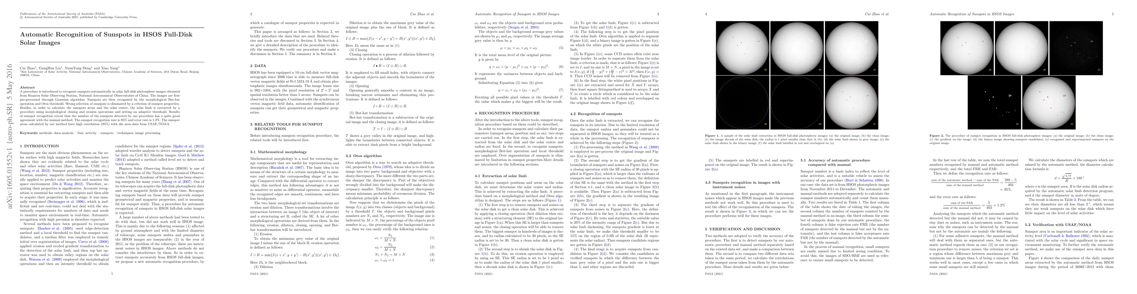 A procedure is introduced to recognise sunspots automatically in solar full-disk photosphere images obtained from Huairou Solar Observing Station, National Astronomical Observatories of China. The images are first pre-processed through Gaussian algorithm. Sunspots are then recognised by the morphological Bot-hat operation and Otsu threshold. Wrong selection of sunspots is eliminated by a criterion of sunspot properties. Besides, in order to calculate the sunspots areas and the solar centre, the solar limb is extracted by a procedure using morphological closing and erosion operations and setting an adaptive threshold. Results of sunspot recognition reveal that the number of the sunspots detected by our procedure has a quite good agreement with the manual method. The sunspot recognition rate is 95% and error rate is 1.2%. The sunspot areas calculated by our method have high correlation (95%) with the area data from USAF/NOAA.