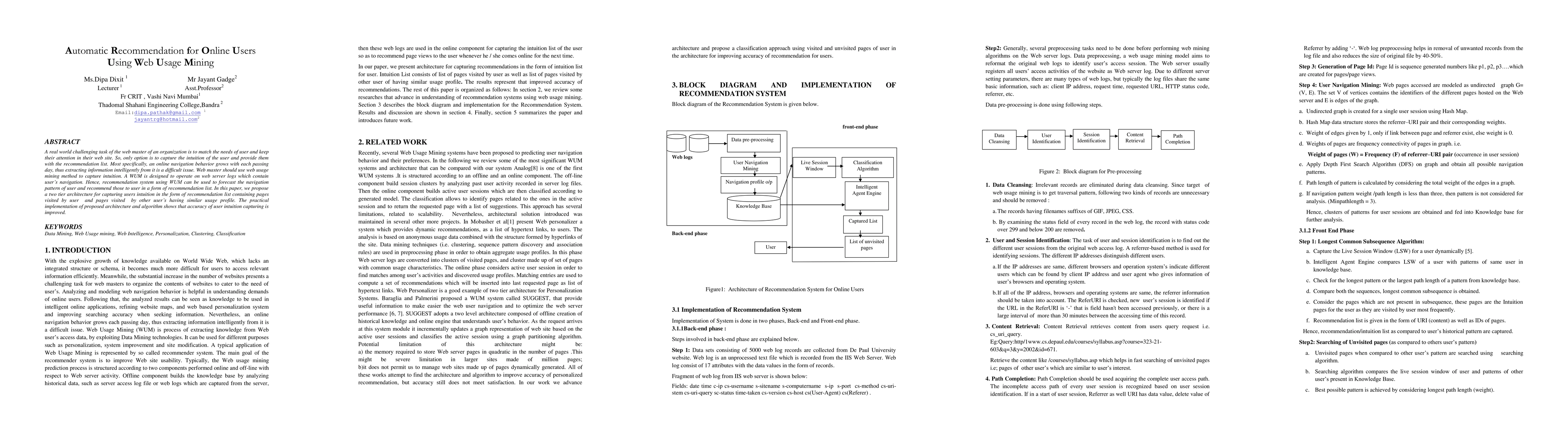 A two-tier architecture is proposed to capture user intuition in the form of a recommendation list containing pages visited by users and pages visited by other users having similar usage profiles.