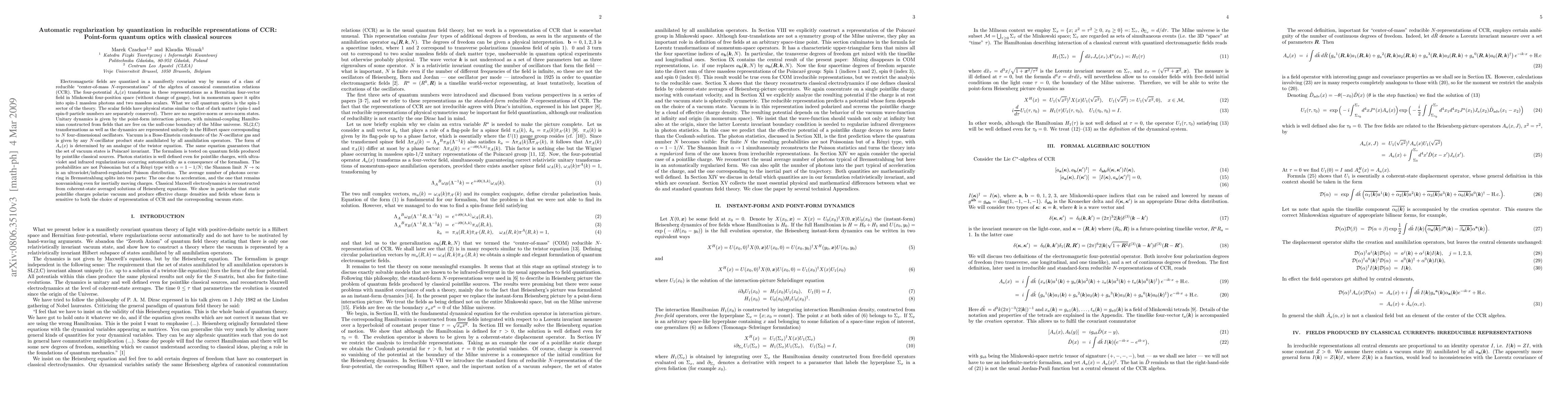 Electromagnetic fields are quantized in manifestly covariant way by means of a class of reducible representations of CCR. $A_a(x)$ transforms as a Hermitian four-vector field in Minkowski four-position space (no change of gauge), but in momentum space it splits into spin-1 massless photons (optics) and two massless scalars (similar to dark matter). Unitary dynamics is given by point-form interaction picture, with minimal-coupling Hamiltonian constructed from fields that are free on the null-cone boundary of the Milne universe. SL(2,C) transformations and dynamics are represented unitarily in positive-norm Hilbert space describing $N$ four-dimensional oscillators. Vacuum is a Bose-Einstein condensate of the $N$-oscillator gas. Both the form of $A_a(x)$ and its transformation properties are determined by an analogue of the twistor equation. The same equation guarantees that the subspace of vacuum states is, as a whole, Poincar\'e invariant. The formalism is tested on quantum fields produced by pointlike classical sources. Photon statistics is well defined even for pointlike charges, with UV/IR regularizations occurring automatically as a consequence of the formalism. The probabilities are not Poissonian but of a R\'enyi type with $\alpha=1-1/N$. The average number of photons occurring in Bremsstrahlung splits into two parts: The one due to acceleration, and the one that remains nonzero even if motion is inertial. Classical Maxwell electrodynamics is reconstructed from coherent-state averaged solutions of Heisenberg equations. Static pointlike charges polarize vacuum and produce effective charge densities and fields whose form is sensitive to both the choice of representation of CCR and the corresponding vacuum state.