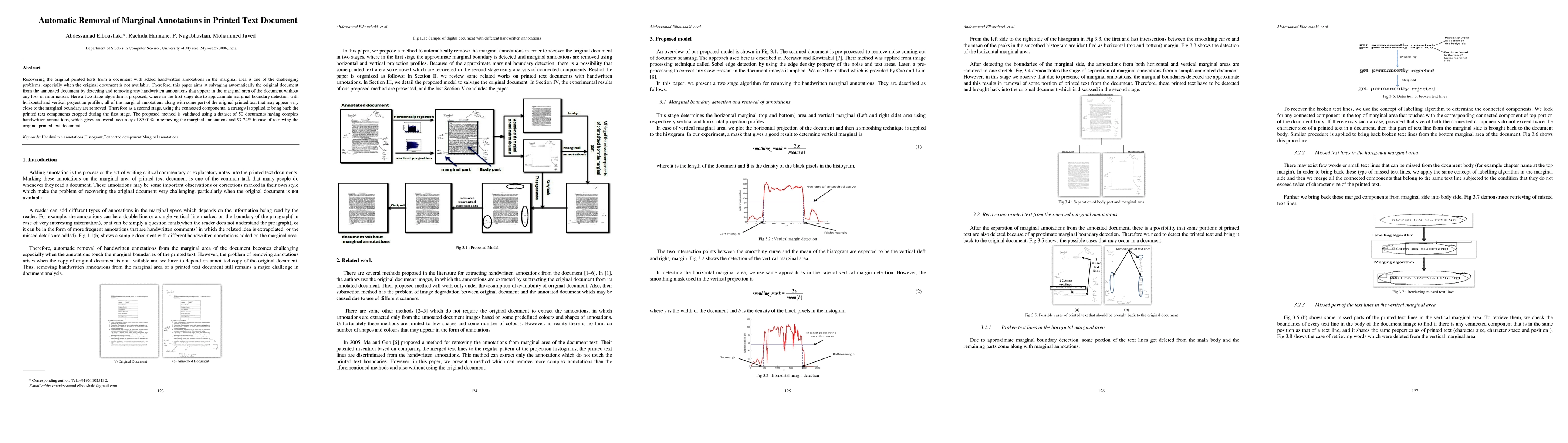 This paper proposes a two-stage algorithm to automatically detect and remove handwritten marginal annotations from printed documents, ensuring minimal loss of original text. The method achieves 89.01% accuracy in removing annotations and 97.74% in retrieving original text, validated on a dataset of 50 complex annotated documents.