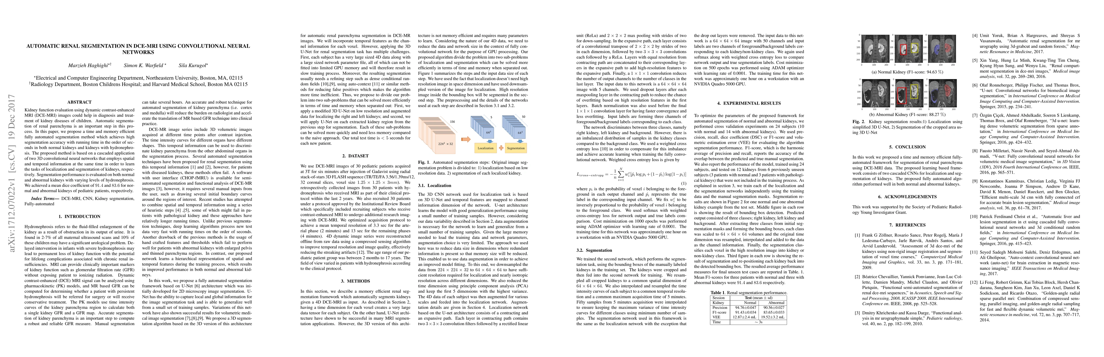 This paper proposes a fully automated method for renal segmentation in DCE-MRI using two 3D convolutional neural networks, achieving high accuracy with seconds-scale processing times. The method demonstrates a mean dice coefficient of 91.4% for normal and 83.6% for hydronephrotic kidneys in pediatric patients.