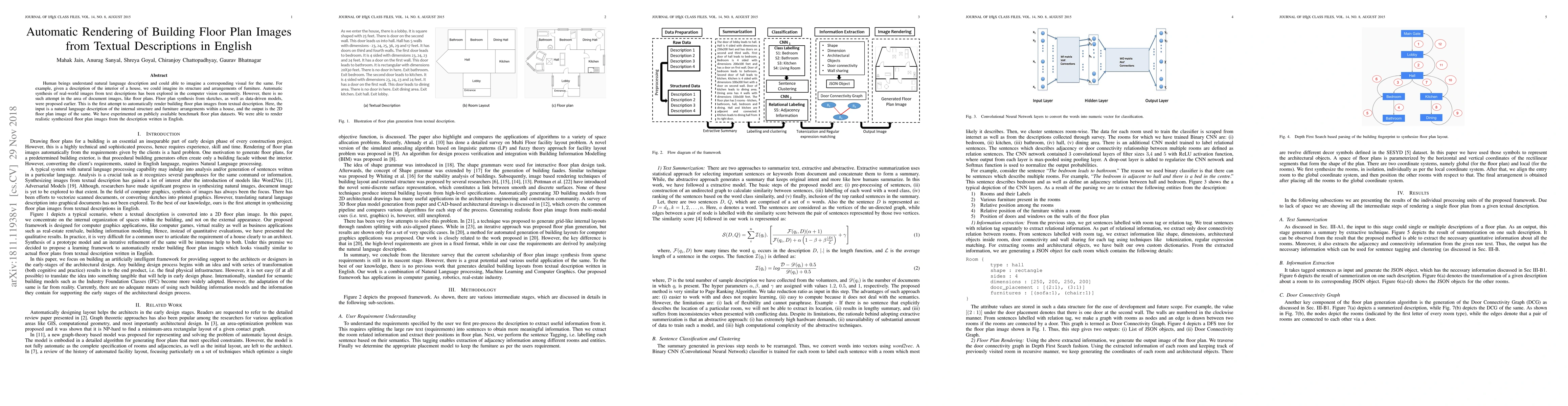 This paper presents the first automatic method to generate building floor plan images from textual descriptions in English. The approach synthesizes realistic 2D floor plan images based on natural language inputs describing internal structures and furniture arrangements, tested on benchmark datasets.