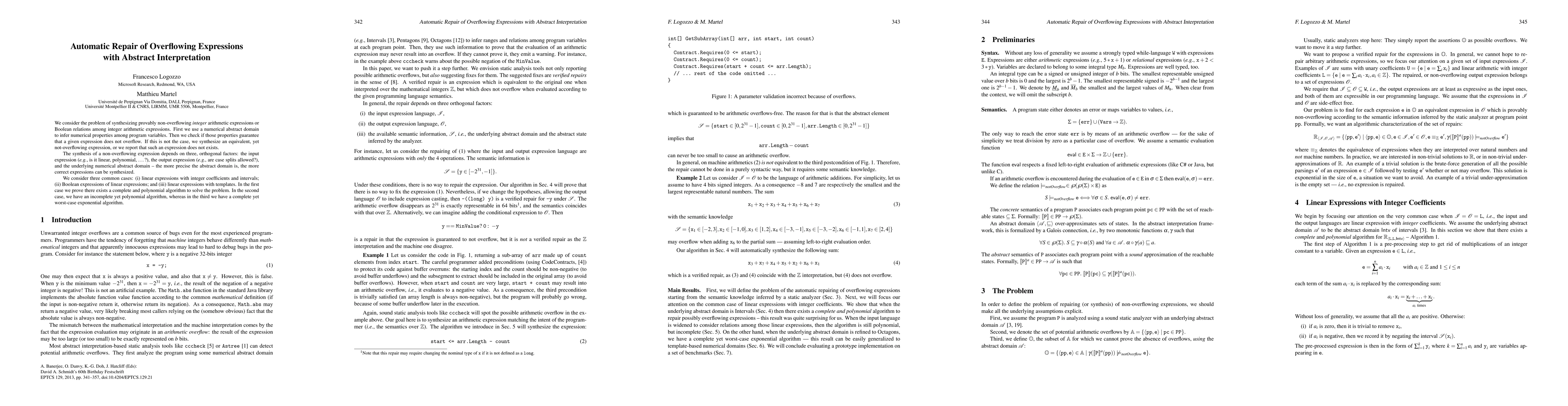 This research introduces a method using abstract interpretation to automatically repair overflowing integer arithmetic expressions, ensuring non-overflow. It presents complete polynomial algorithms for linear expressions with integer coefficients and intervals, incomplete polynomial algorithms for Boolean expressions of linear ones, and a complete yet exponential algorithm for linear expressions with templates.
