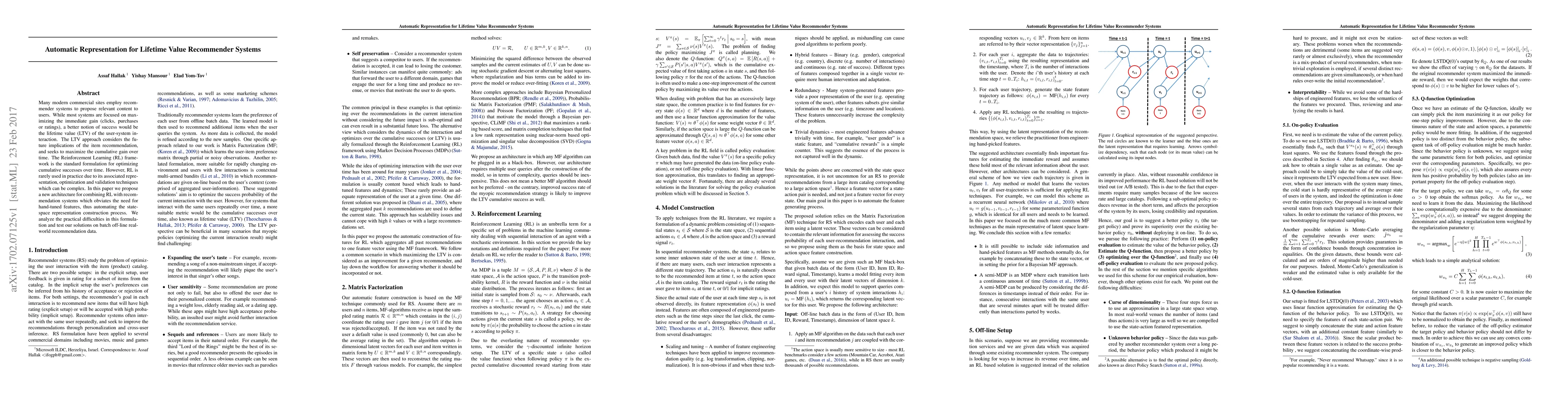 Many modern commercial sites employ recommender systems to propose relevant content to users. While most systems are focused on maximizing the immediate gain (clicks, purchases or ratings), a better notion of success would be the lifetime value (LTV) of the user-system interaction. The LTV approach considers the future implications of the item recommendation, and seeks to maximize the cumulative gain over time. The Reinforcement Learning (RL) framework is the standard formulation for optimizing cumulative successes over time. However, RL is rarely used in practice due to its associated representation, optimization and validation techniques which can be complex. In this paper we propose a new architecture for combining RL with recommendation systems which obviates the need for hand-tuned features, thus automating the state-space representation construction process. We analyze the practical difficulties in this formulation and test our solutions on batch off-line real-world recommendation data.