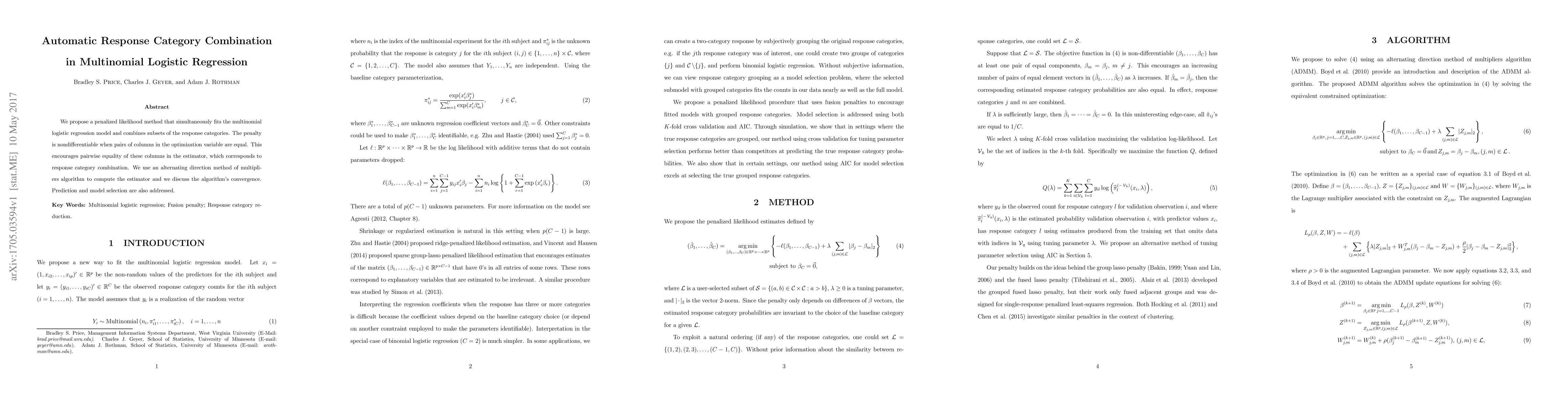 Researchers propose a new method for combining response categories in multinomial logistic regression models, using an alternating direction method of multipliers algorithm to encourage pairwise equality between columns.