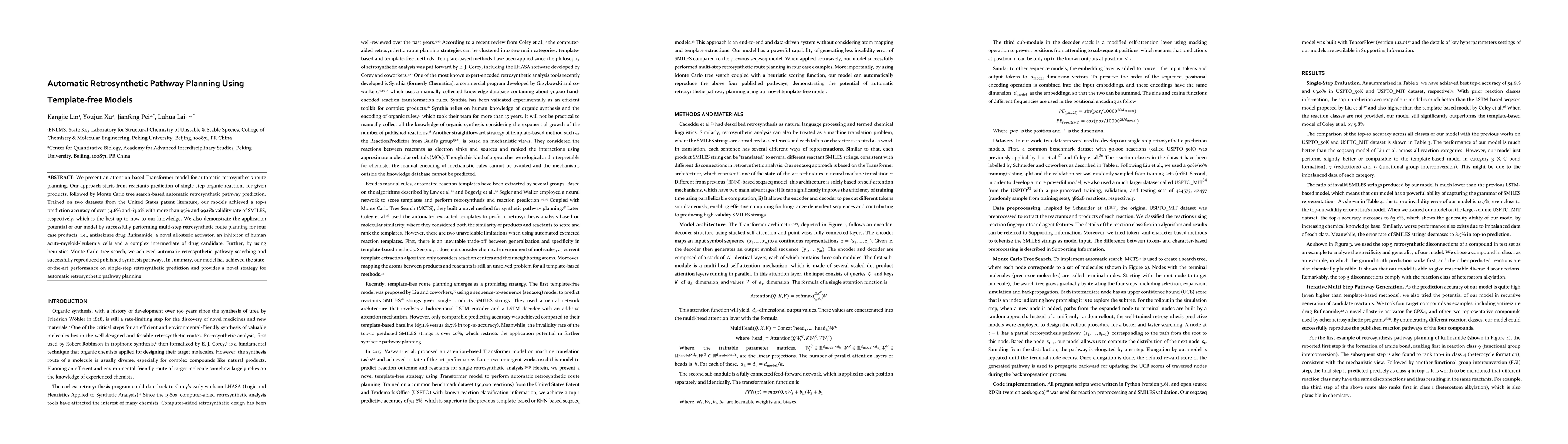 This paper introduces an attention-based Transformer model for automatic retrosynthetic pathway planning, achieving top-1 prediction accuracy of over 54.6% and 63.0% on two datasets. The model successfully performs multi-step retrosynthetic route planning for various complex compounds, demonstrating state-of-the-art performance and potential for automated synthesis pathway discovery.