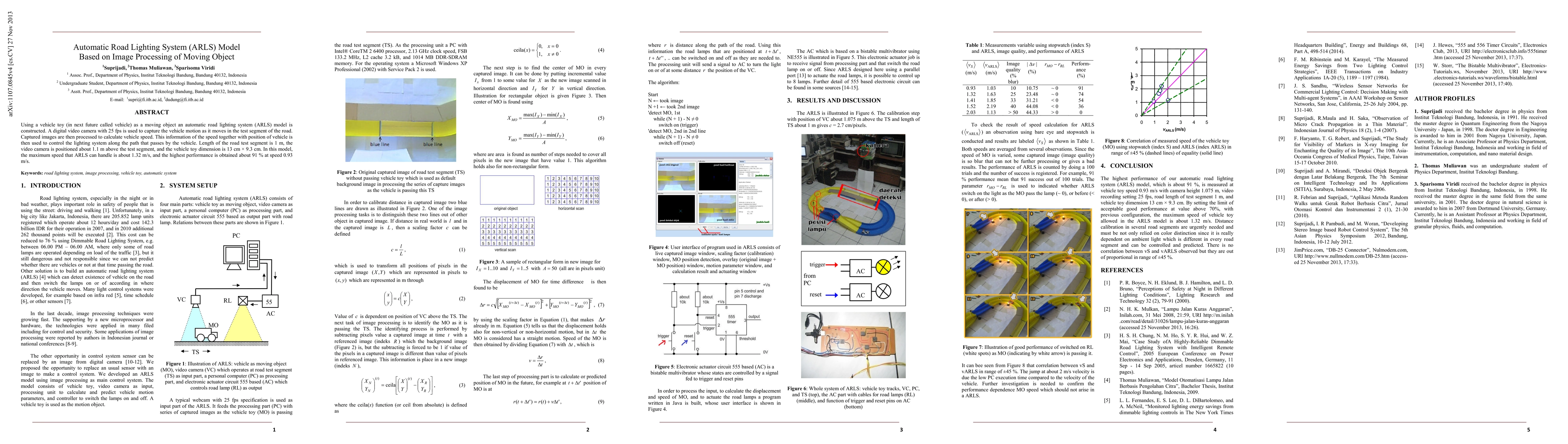 Using a vehicle toy (in next future called vehicle) as a moving object an automatic road lighting system (ARLS) model is constructed. A digital video camera with 25 fps is used to capture the vehicle motion as it moves in the test segment of the road. Captured images are then processed to calculate vehicle speed. This information of the speed together with position of vehicle is then used to control the lighting system along the path that passes by the vehicle. Length of the road test segment is 1 m, the video camera is positioned about 1.1 m above the test segment, and the vehicle toy dimension is 13 cm \times 9.3 cm. In this model, the maximum speed that ARLS can handle is about 1.32 m/s, and the highest performance is obtained about 91% at speed 0.93 m/s.