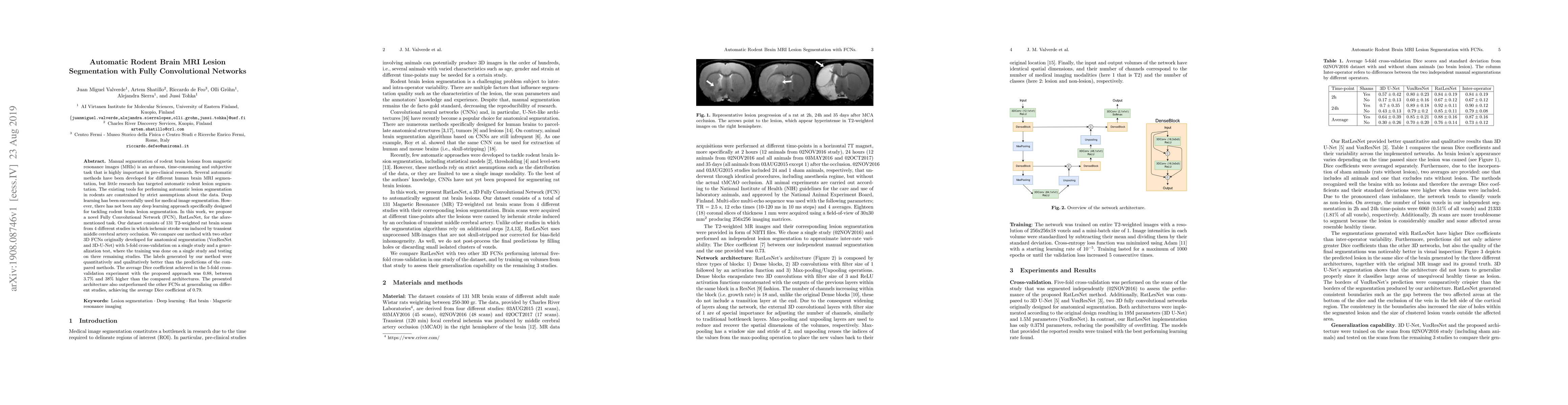 This paper proposes RatLesNet, a novel Fully Convolutional Network for automatic segmentation of rodent brain lesions from MRI scans, outperforming existing 3D FCNs in both accuracy and generalization across different studies. The method achieved an average Dice coefficient of 0.88 in cross-validation and 0.79 in generalization tests.